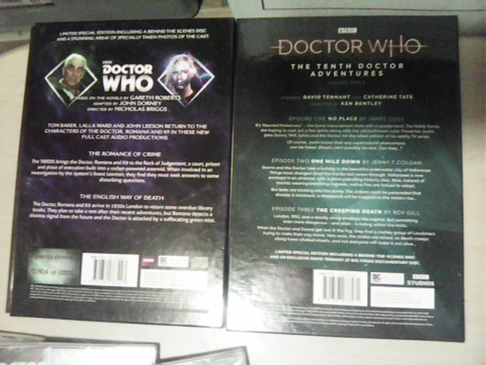 2x used numbered deluxe editions (4 discs in the Tennant set "10th Doctor Adventures, Series Three", 5 discs in the Tom Baker one "English Way Of Death / Romance Of Crime"; each comes with a fabulous glossy full colour book and is contained in a sturdy slipcover).