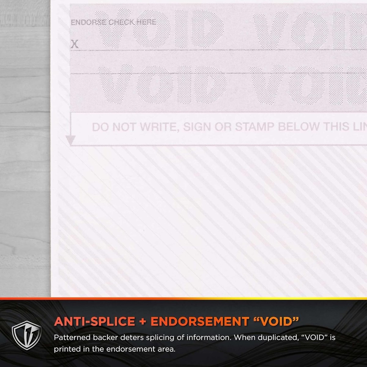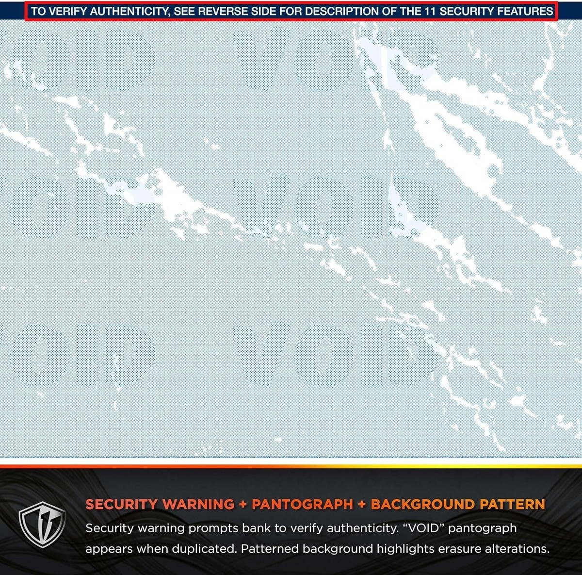 Front security features include: Check-21 compliancy; hidden message technology (?VOID? appears when copied); a printed marble background that shows alterations when erased; and a printed security warning to call attention to the security features listing on the reverse side