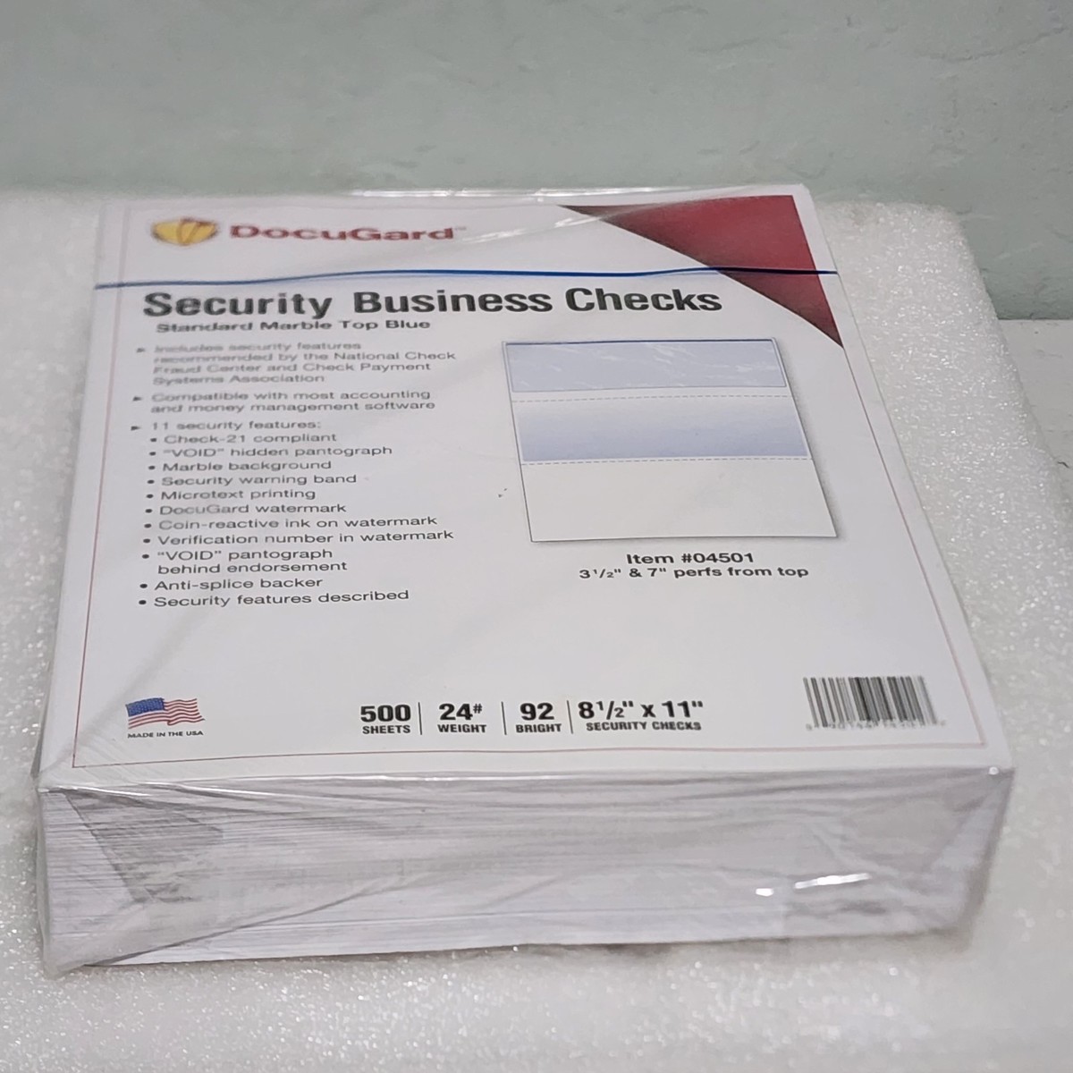 DocuGard blue marble top business checks utilize 11 comprehensive security features recommended by the National Check Fraud Center and are ANSI compliant