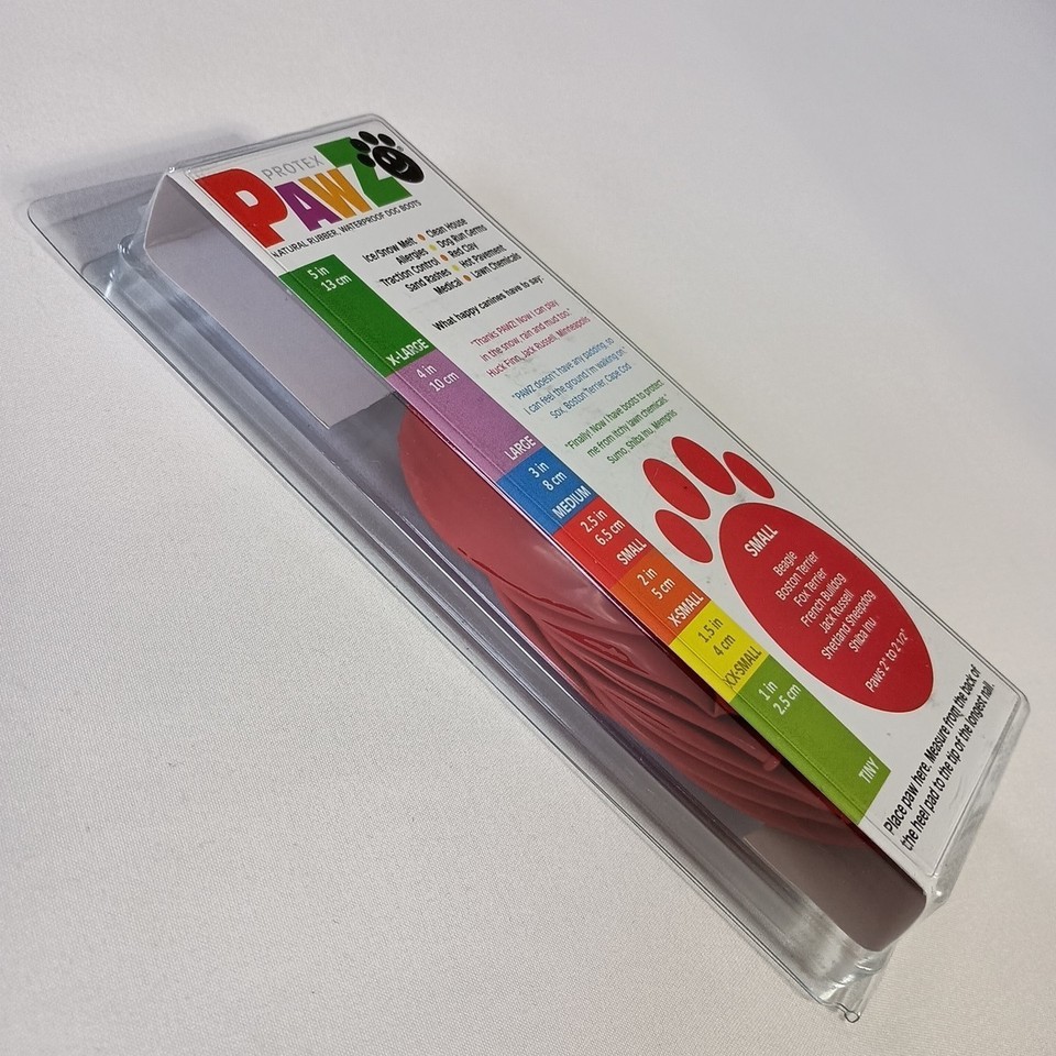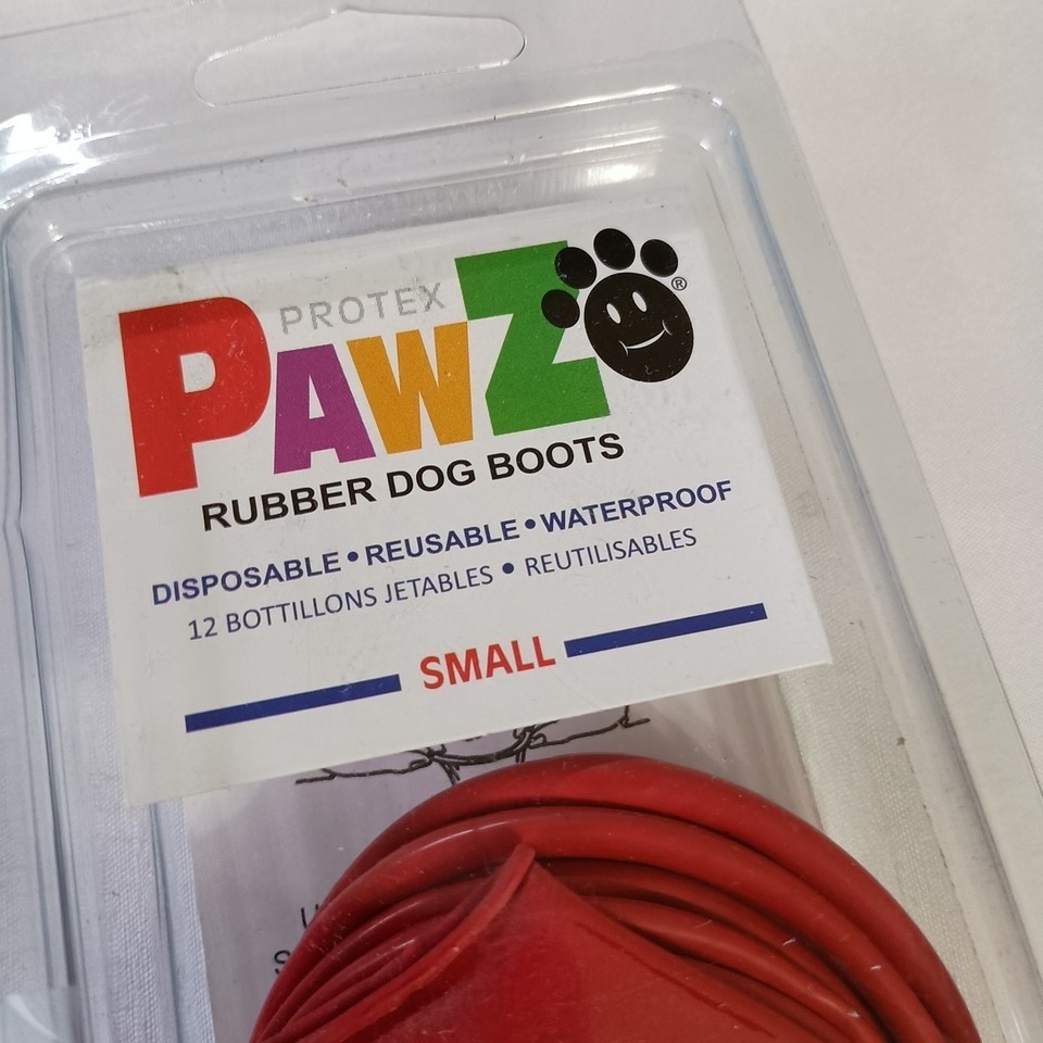These dog boots are designed for small dogs such as Beagles, Boston Terriers, and Jack Russells. They come in a pack of 12 and are both disposable and reusable. The red boots are waterproof, making them perfect for outdoor activities. Made of rubber, they provide protection and comfort for your furry friend's paws. These boots are a practical and stylish choice to keep your dog's feet safe and dry during walks or playtime. Some wear to the package.