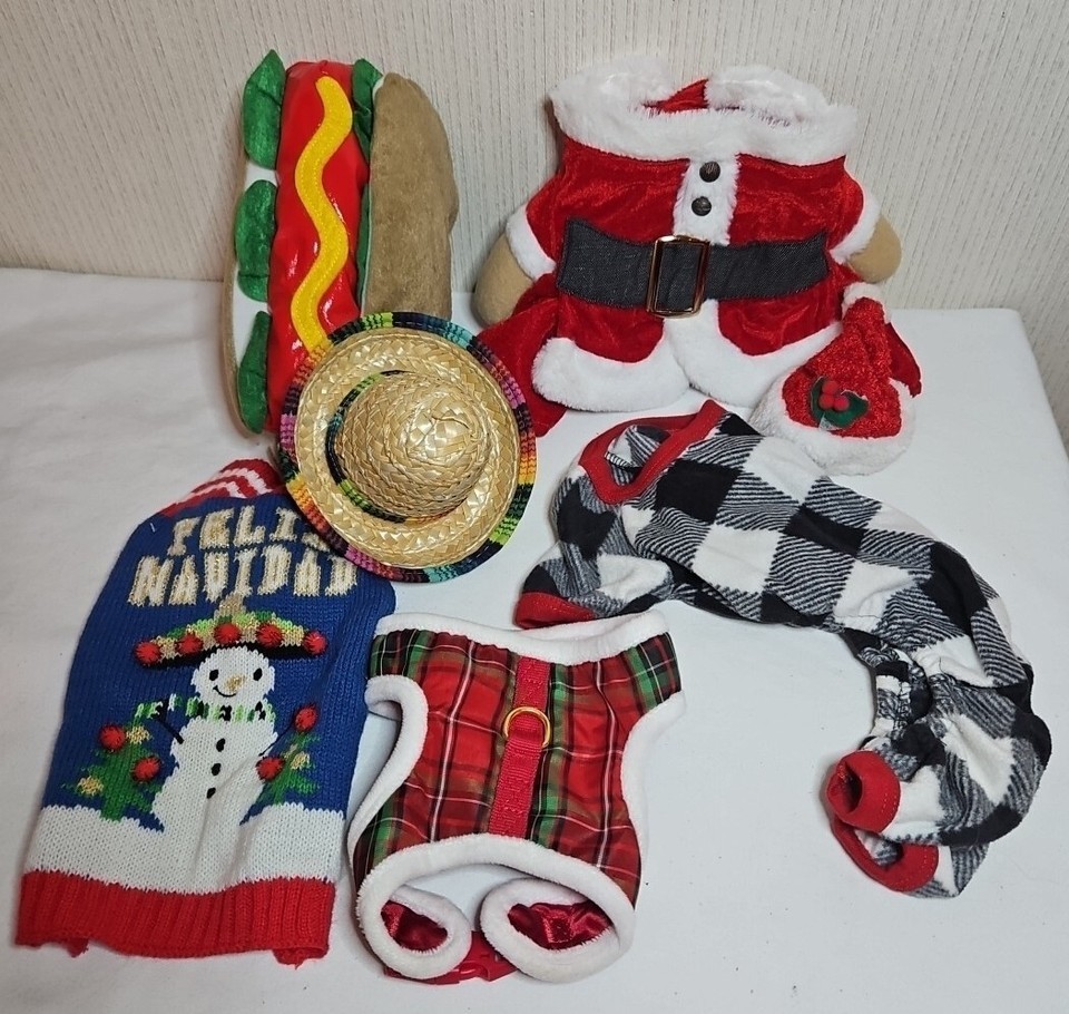- Dog Costume Lot XS Hot Dog Ugly Sweater Sombrero Santa Lumberjack Pajama Harness