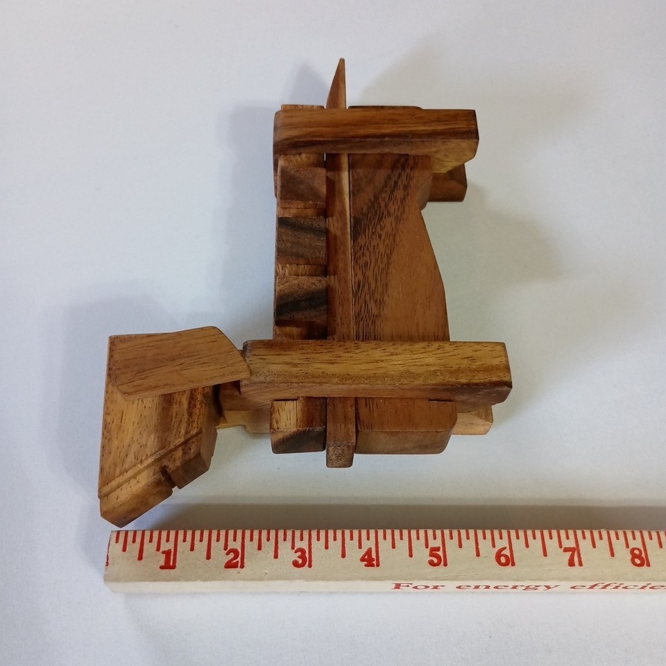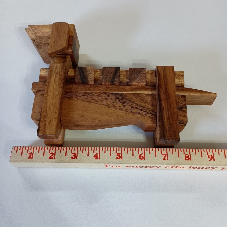 The Dog Puzzle is a 3D wooden brain teaser that features 8 solid natural wood pieces, each shaped like a piece of a dog. The puzzle is a desk toy that challenges the brain and promotes relaxation at the same time. The brown wooden pieces are intricately designed to create a visually appealing and engaging toy for anyone who enjoys puzzles and animal-themed items. With its unique design and high-quality materials, this puzzle is sure to provide hours of entertainment and entertainment. Normal wear. Sizes are approximate.