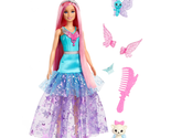 This Barbie doll gives hair play a magical twist! She has 7-inch-long pastel pink hair and includes accessories like a comb, sparkly headband, and decorative hair pin.
