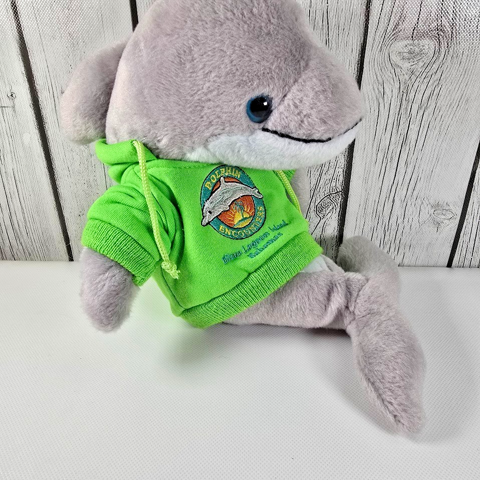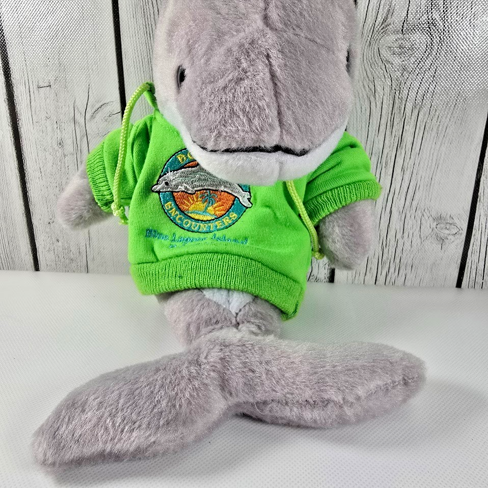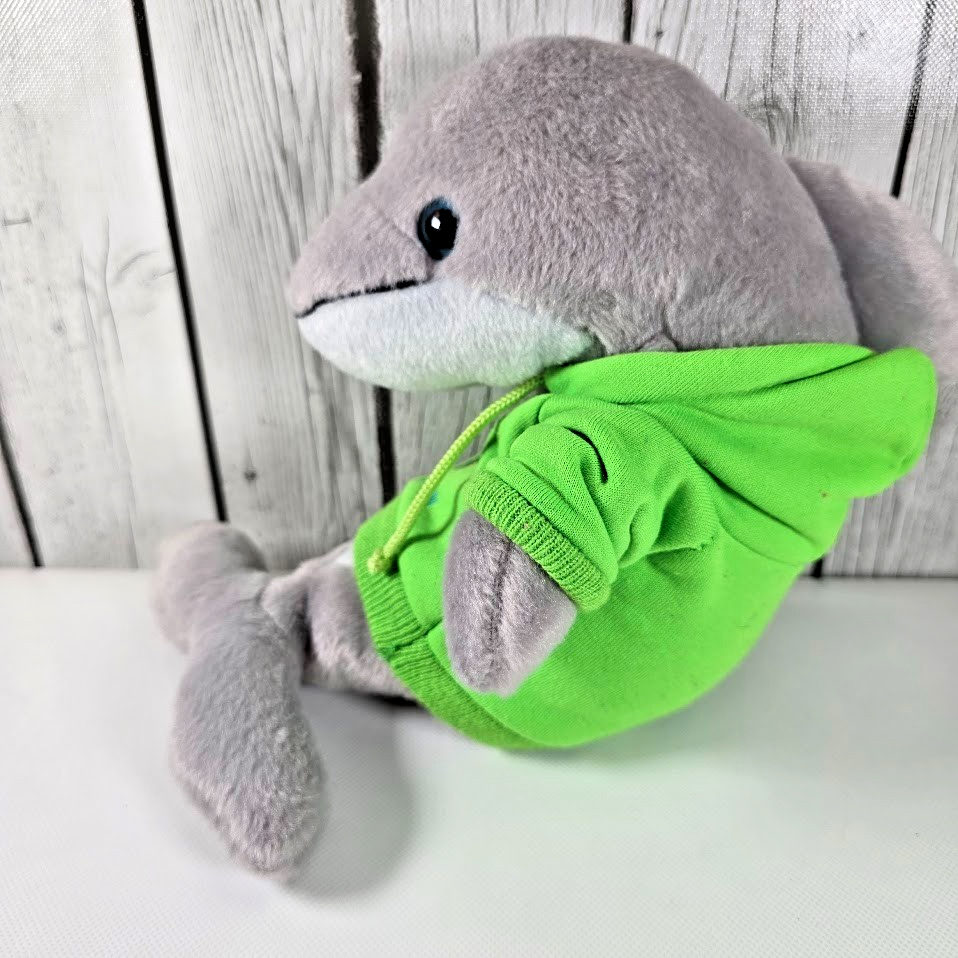 ? Soft gray plush dolphin stuffed animal with bright green hoodie embroidered Blue Lagoon Island logo 10? long