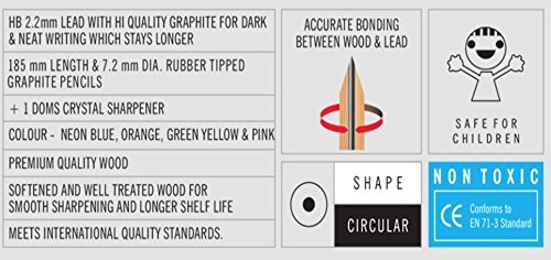 Product description: Welcome to the beautiful world of DOMS sharp minds. Enjoy the DOMS range of products with preoise features crafted for you to explore your creativity to the maximum. Neon Rubber Tipped Graphite10 Pencils *High Quality Graphite For Dark And Neat Writing Which Stays Longer * Accurate Bonding Process * Softened And Well Treated Wood 1 Box.