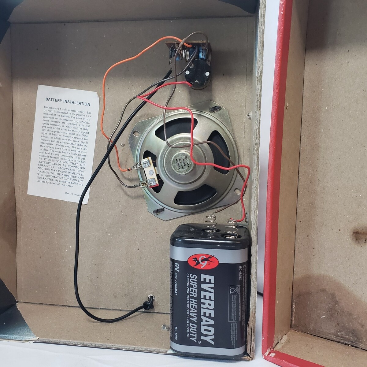 We purchased a battery for testing purposes, and item works. Speaker is not "big powerful" as advertising claimed on box; however, the sound is clear, albeit low (as shown in video). As shown in photos, this item includes an Eveready Super Heavy Duty 6V Spring Lantern Battery is included. See instructions inside amplifier to connect battery. Easily slide out front of amplifier to access battery location/installation. When turning item off on, you may hear static from the volume control knob (as shown in video). We put microphone next to a cellphone speaker in order for you to hear music playing from amplifier speaker. Music not included. Item is stored in a climate-controlled/smoke-free environment.