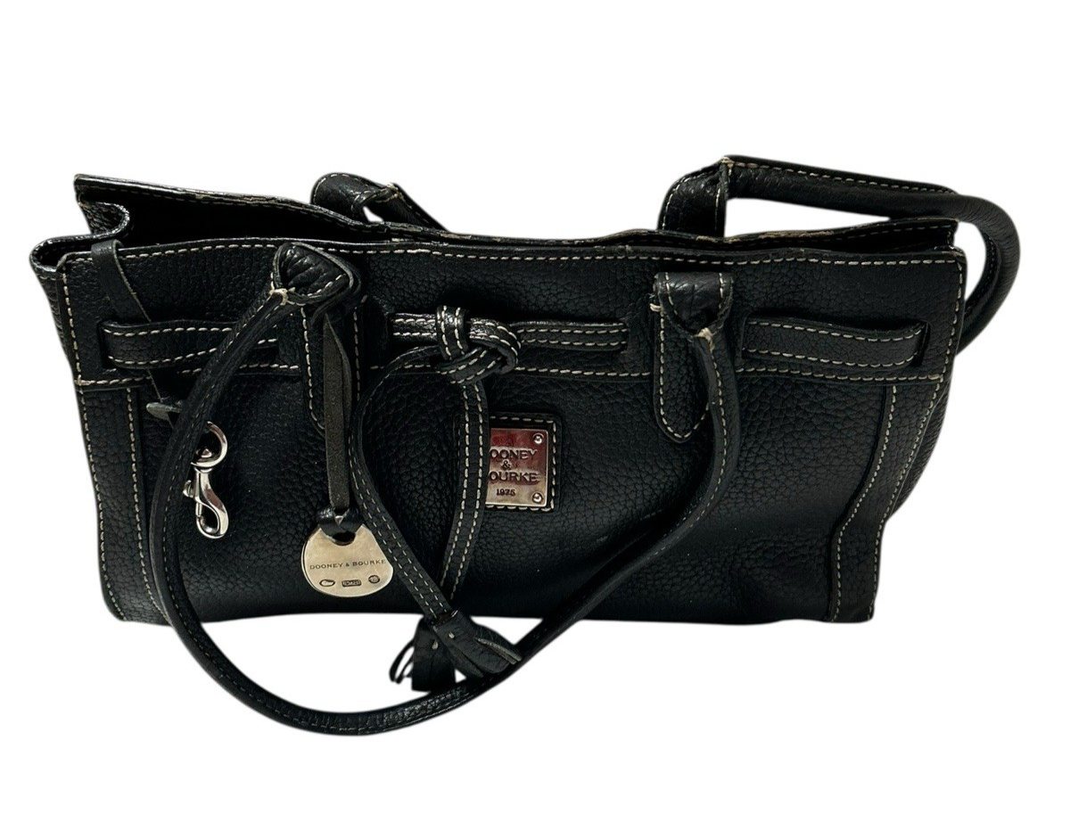 The Dooney Bourke black pebbled leather handbag is a stylish and versatile accessory for women. Made from high-quality leather with a pebbled finish, this medium-sized shoulder bag features a classic drawstring closure and tasseled accents for added flair. The handbag also includes a bag charm and is part of the Dooney Bourke Pebble Grain product line, making it a timeless and practical choice for everyday use.