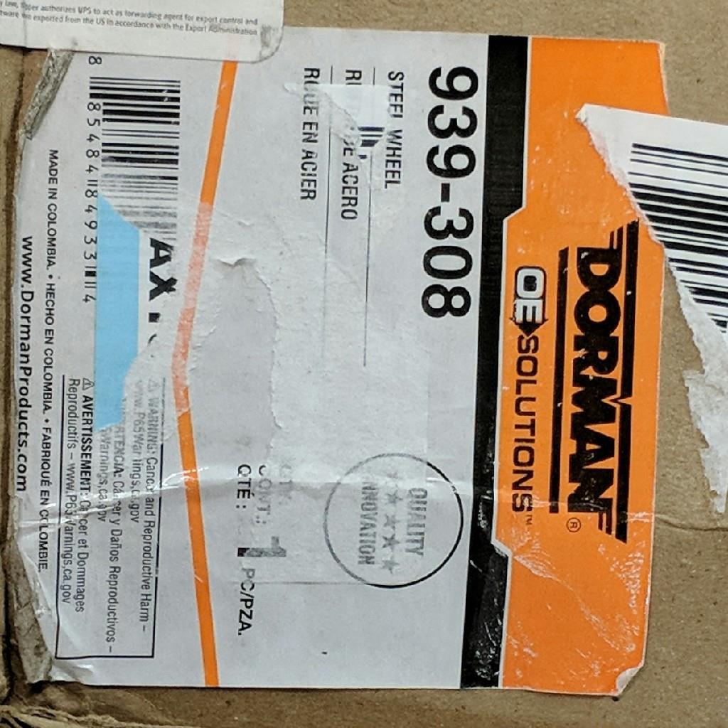 Dorman 939-308 is a black steel wheel designed for 04-05 Dodge Neon with a rim diameter of 15 inches, rim width of 6 inches, and bolt pattern of 5x100. It has a conical seat compatible fastener seat type, forged wheel construction, and 40mm offset. The wheel has a teledial style and a painted finish. The hub bore is 57.1mm, and it comes with an OE/OEM part number of 4656322AB. The product is a new old stock (NOS) item manufactured in Colombia and sold in a quantity of one.