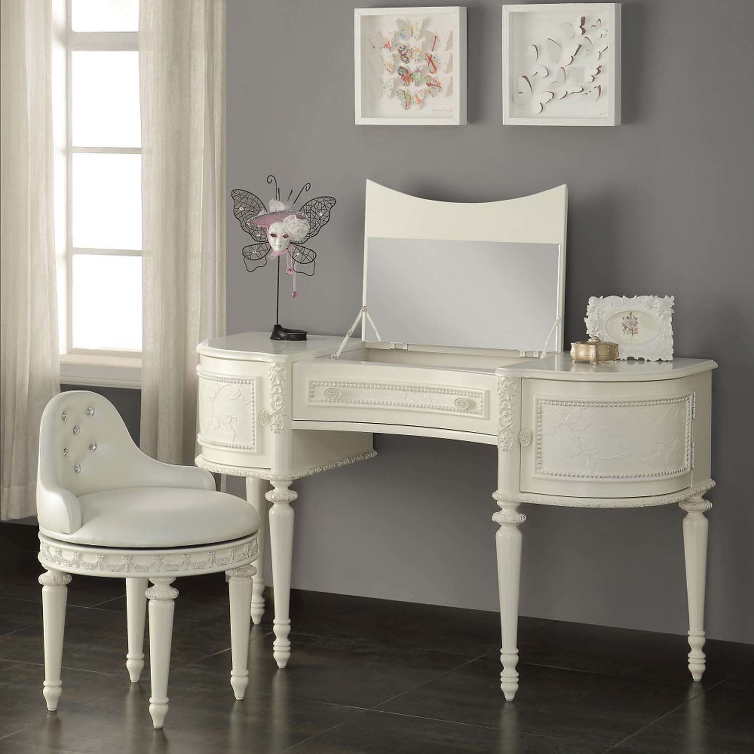 The Dorothy vanity chair with swivel is great for a tween who is getting into makeup and fashion. It will aid them in getting glamorous for the day with its plush foam padded seat. This chair features crystal-like button tufting for a touch of glamour. It is upholstered in luxurious pearl-white synthetic leather. The apron has ribbon bunting trim for an added girly feel. The wooden turned legs are the perfect finishing touch. The vanity desk is sold separately.
