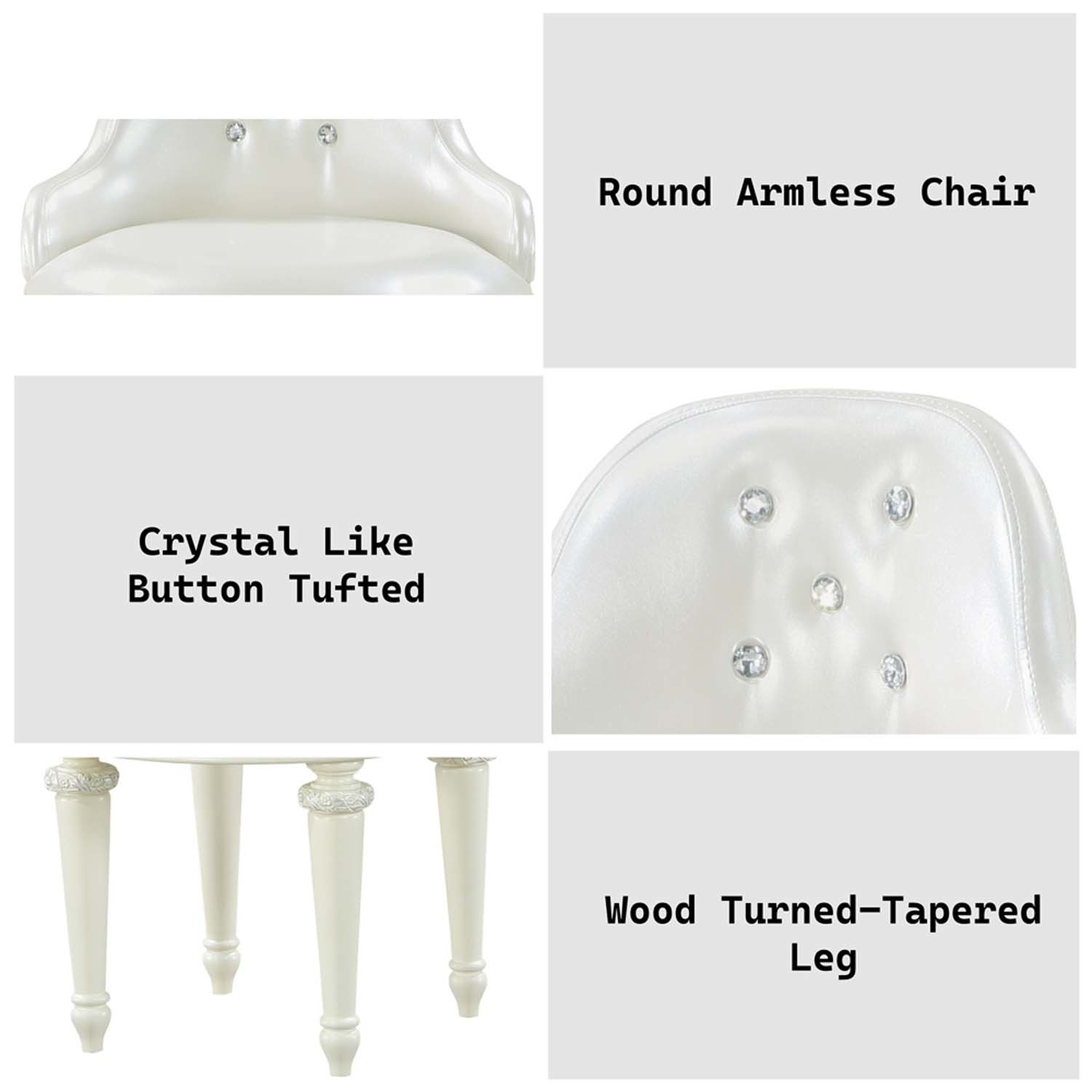 Features: Round Armless Chair (Low Backrest) Swivel Seat Crystal Like Button Tufted (Inside Backrest) Padded Back Seat: Pearl White PU Cushion Wood Seat Apron with Ornamental Trim Set Includes: One (1) Vanity Stool