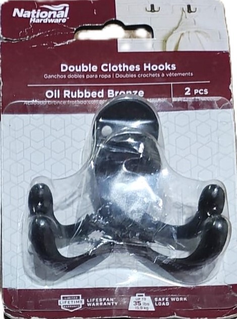 Add both function and classic style to any room with the National Hardware N330-829 Double Clothes Hook in Oil Rubbed Bronze, a durable, wall-mounted hook set designed for everyday use in bedrooms, bathrooms, closets, entryways, and more. Crafted from heavy-duty zinc die-cast, this double hook is built for strength and long-term reliability, supporting up to 35 pounds?ideal for hanging coats, robes, towels, bags, hats, and other essentials without bending or pulling out of the wall.