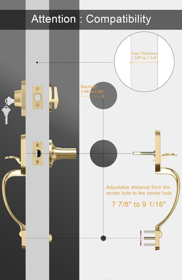 ?????????? ????? ??? ????????? - Adjustable latch to fit 2 3/8" or 2 3/4" backsets. Fits on 1 3/8" to 1 3/4" thick doors. Adjustable distance from the center hole of the handle to the center hole is 7 7/8" to 9 1/16". Please measure the door thickness and backsets before purchasing.