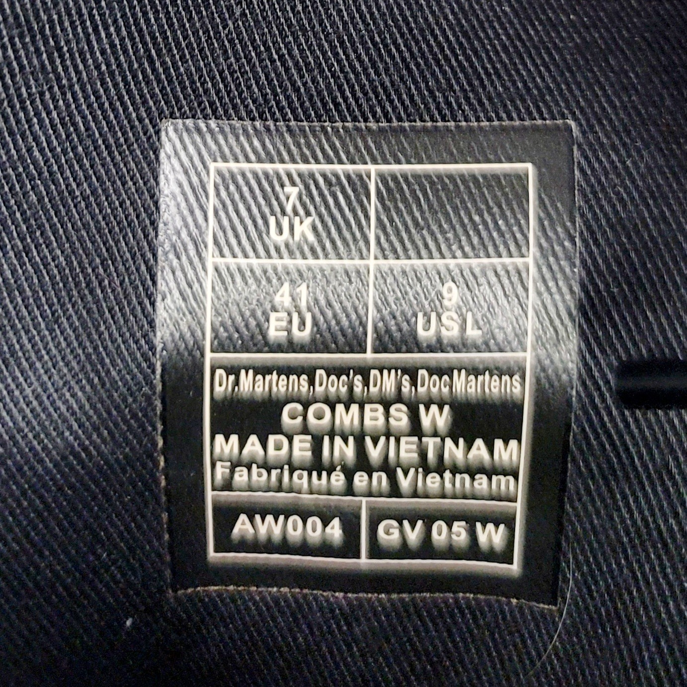 The product is a lightly used pair of Dr. Martens women's black canvas comb boots in UK size 7/US size 9. These lace-up combat boots feature a synthetic upper material with a canvas lining. The classic black color and combat style make them a versatile and edgy addition to any fashion wardrobe. Perfect for adding a touch of punk rock flair to any outfit, these boots are a must-have for any stylish woman.