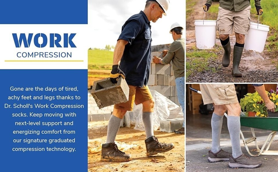 Dr. Scholl's Work Compression Support Socks are designed to provide your legs with the comfort and relief you need everyday, all day. These men's over the calf socks are constructed with the greatest support at the ankle that graduates up the leg to improve circulation which energizes, renews and restores leg comfort. The socks are light compression (8-15mmHg). Made in the U.S.A.
