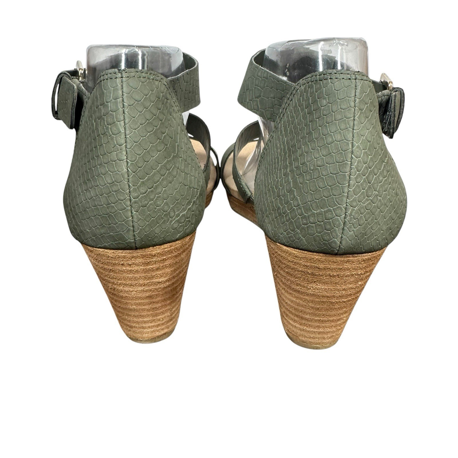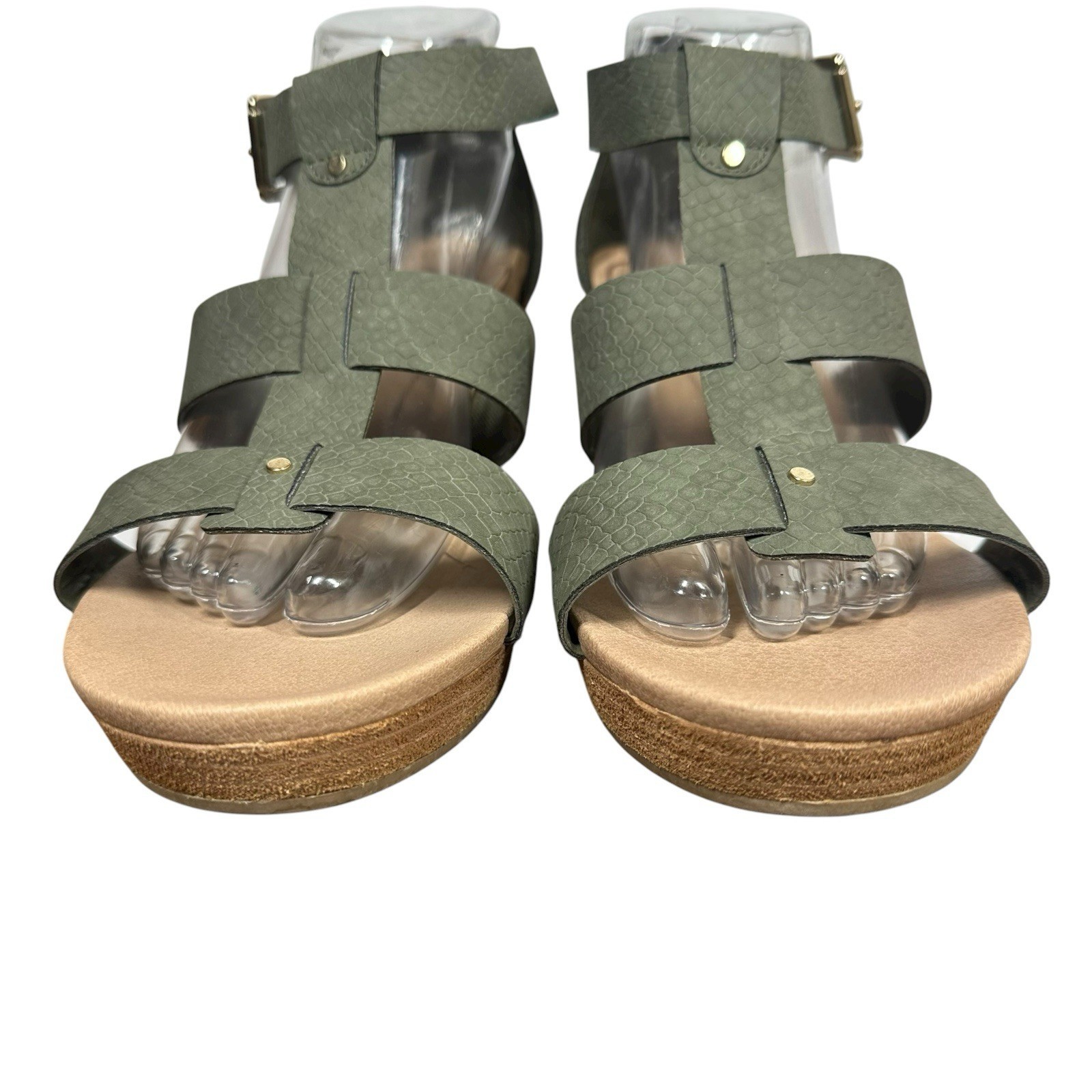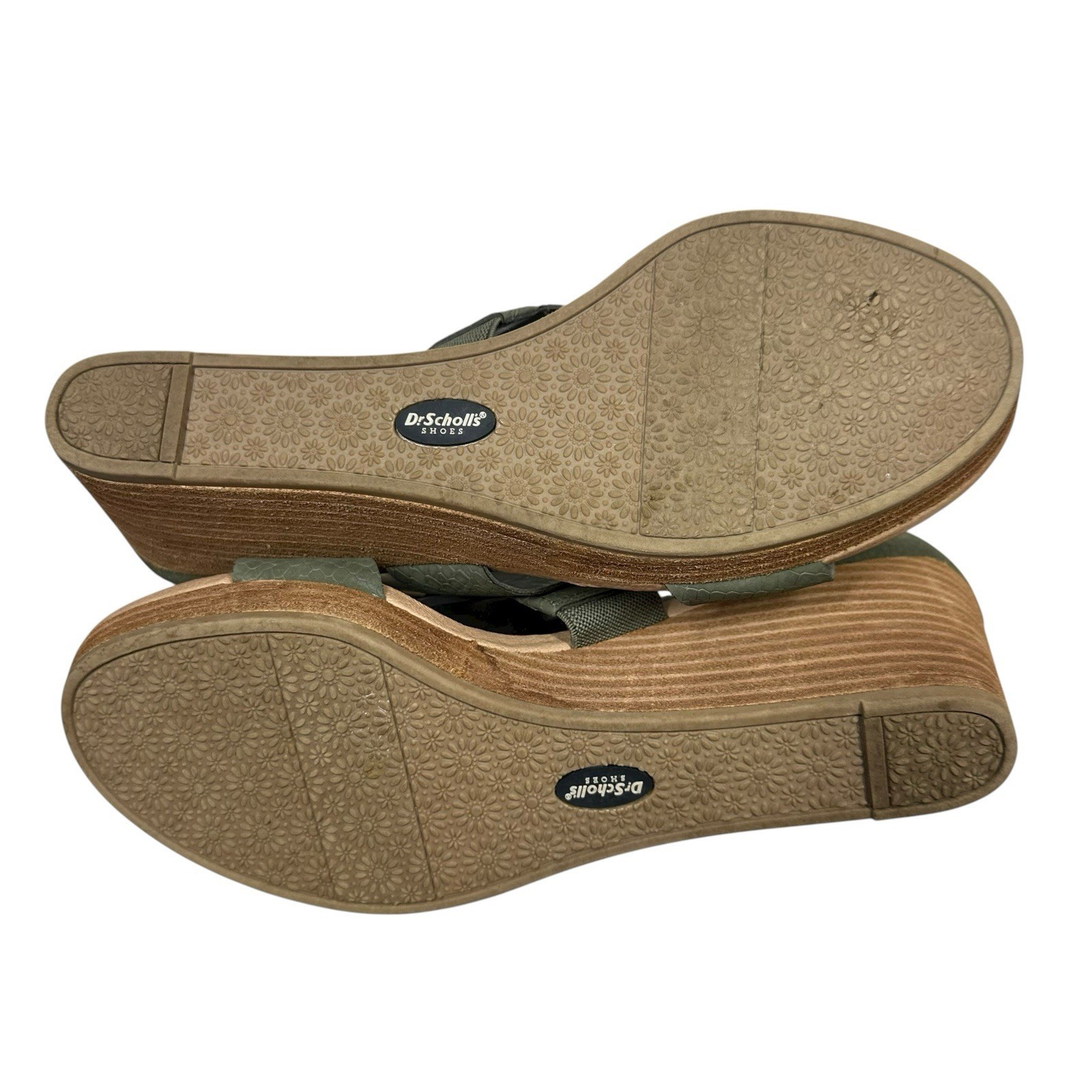 - Dr Scholls Barton Wedge Sandals Sz 10W Olive Green Faux Leather Strappy Comfort