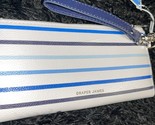 The Draper James New Travel Wallet/wristlet is a stylish and functional accessory designed specifically for women on the go. This wallet comes in a versatile blue color and features a convenient wristlet style design, perfect for keeping all your essentials close at hand.