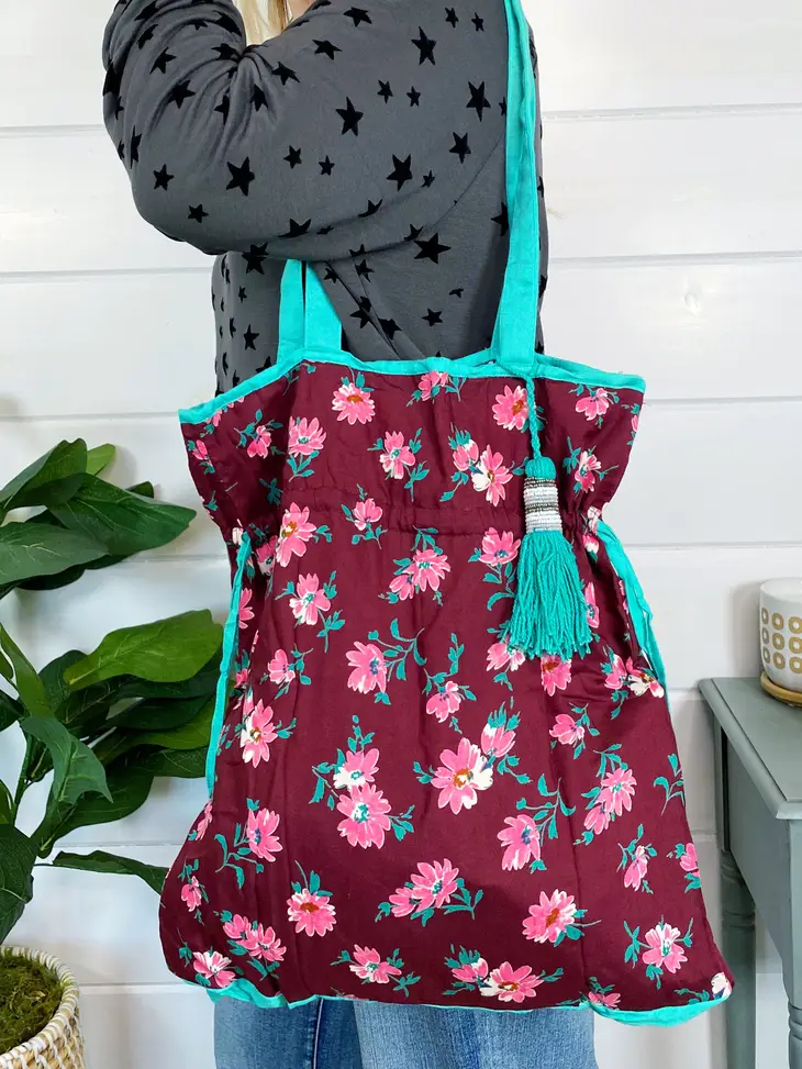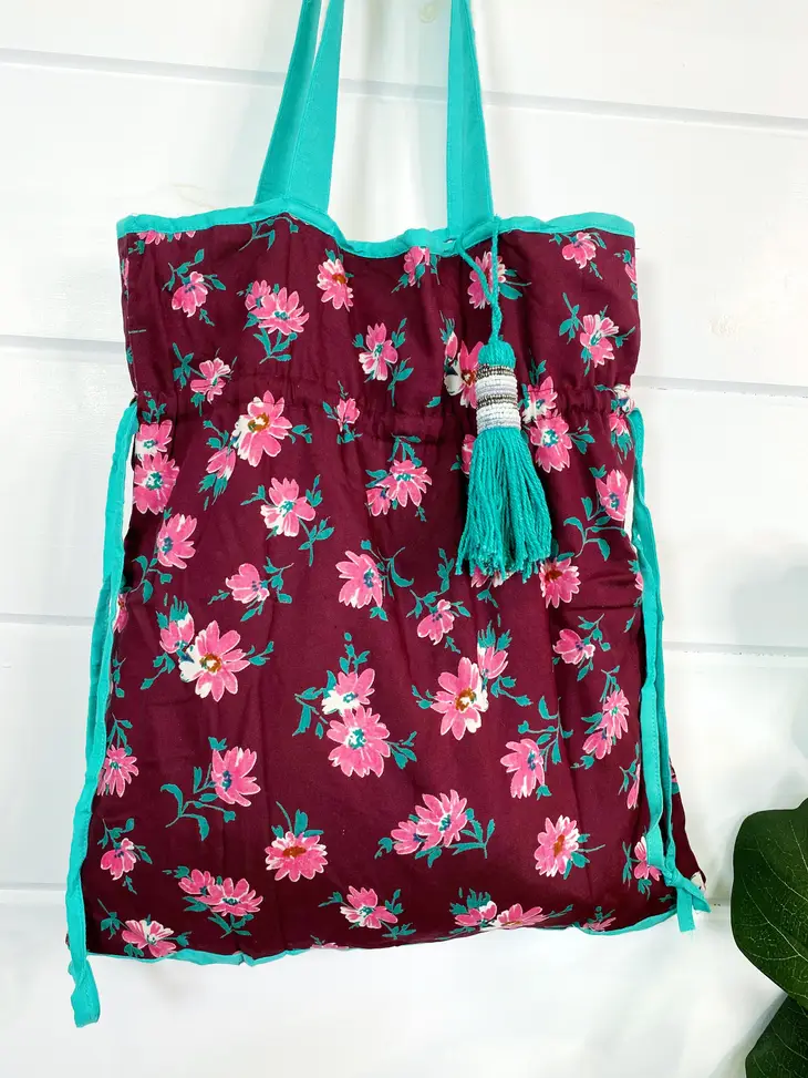 Drawstring Cotton Market Tote Shopping Bag Maroon Pink Aqua