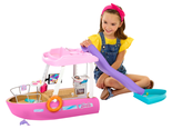 Make waves with the Barbie Dream Boat! This playset is decked out with premium details like a pool, slide, two different transformations, and so much more. Barbie doll can climb to the top deck to steer the boat and relax in the sun, then slide down into the pool! Kids can even remove the top deck for easy play access. Doll not included. Six play areas include a bathroom, sun deck, pool and slide, bedroom, kitchen and living room. Transform the living room and kitchen into a bedroom and bathroom in just a few seconds! This Barbie boat comes with 20+ pieces! There are water-themed accessories like fins and a snorkel, as well as fun extras like an underwater camera, food, drinks and even a boombox. A puppy and dolphin make great animal friends to accompany Barbie doll on her high-sea adventures! Take to the sea in style with the Barbie Dream Boat! It?s the perfect gift for kids ages 3 years old and up.