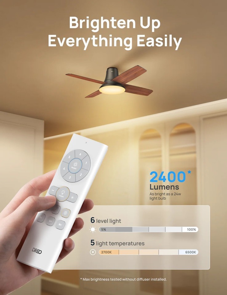 - Dreo CLF513 Low Profile, 44" Reversable, 6 Speed, 6-Level Dimmable Ceiling Fan