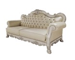 Introducing one of our most famous collections, Dresden in a new antique pearl white finish. This sofa has a classic feel, featuring decorative carvings throughout the frame, that create a classic piece. Sitting on claw feet for style and stability. It is hand-brushed with silver accents that make the carvings pop. Upholstered in luxurious synthetic leather for a modern touch. The backrest is button tufted with crystal-like buttons for glamour and drama. Finished off with classic nailhead trim. Four throw pillows are included.