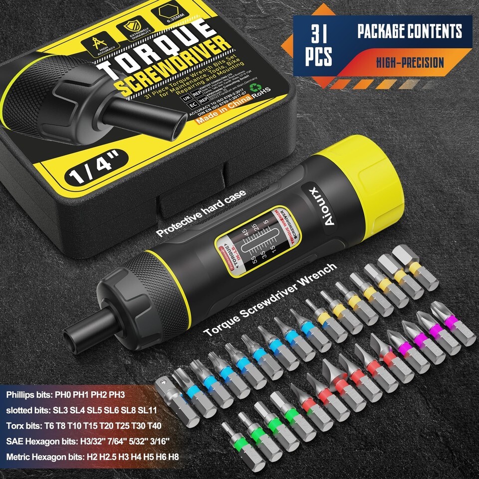 1 x high-precision preset torque screwdriver, 4 x Phillips bits: PH0, PH1, PH2, PH3; 6 x slotted bits: SL3mm, 4mm, 5mm, 6mm, 8mm, 11mm; 8 x Torx bits: T6, T8, T10, T15, T20, T25, T30, T40; 11 x Hexagon bits: H3/32", 7/64", 5/32", 3/16", H2mm, 2.5mm, 3mm, 4mm, 5mm, 6mm, 8mm. 1 x 1/4" hex to 1/4" driver socket adapter, and protective hard case