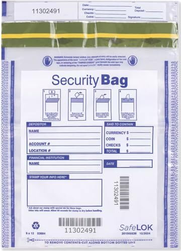 Product description: Our new ultra level tamper evident colsure gives you security against all mechanical, chemical, thermal, and moisture tampering attempts. The upgraded tamper evident security closure provides an extra film that adhesive seals onto keeping pressure off of the header. A new face cut design in the header makes it impossible to reposition after opening without an obvious void. The artwork update includes easy to understand pictorial instructions shown to increase deposit accuracy and reduce banking transactions fees. Previous deposit bags featured a tear off receipt above the closure. The receipt is now the release liner, which saves time and material. Us the receipt for convenient tracking and deposit identification. It is a number 4 recuclable plastic with a unique serial number printed on the receipt and the bag. See PDF on this listing for more details.