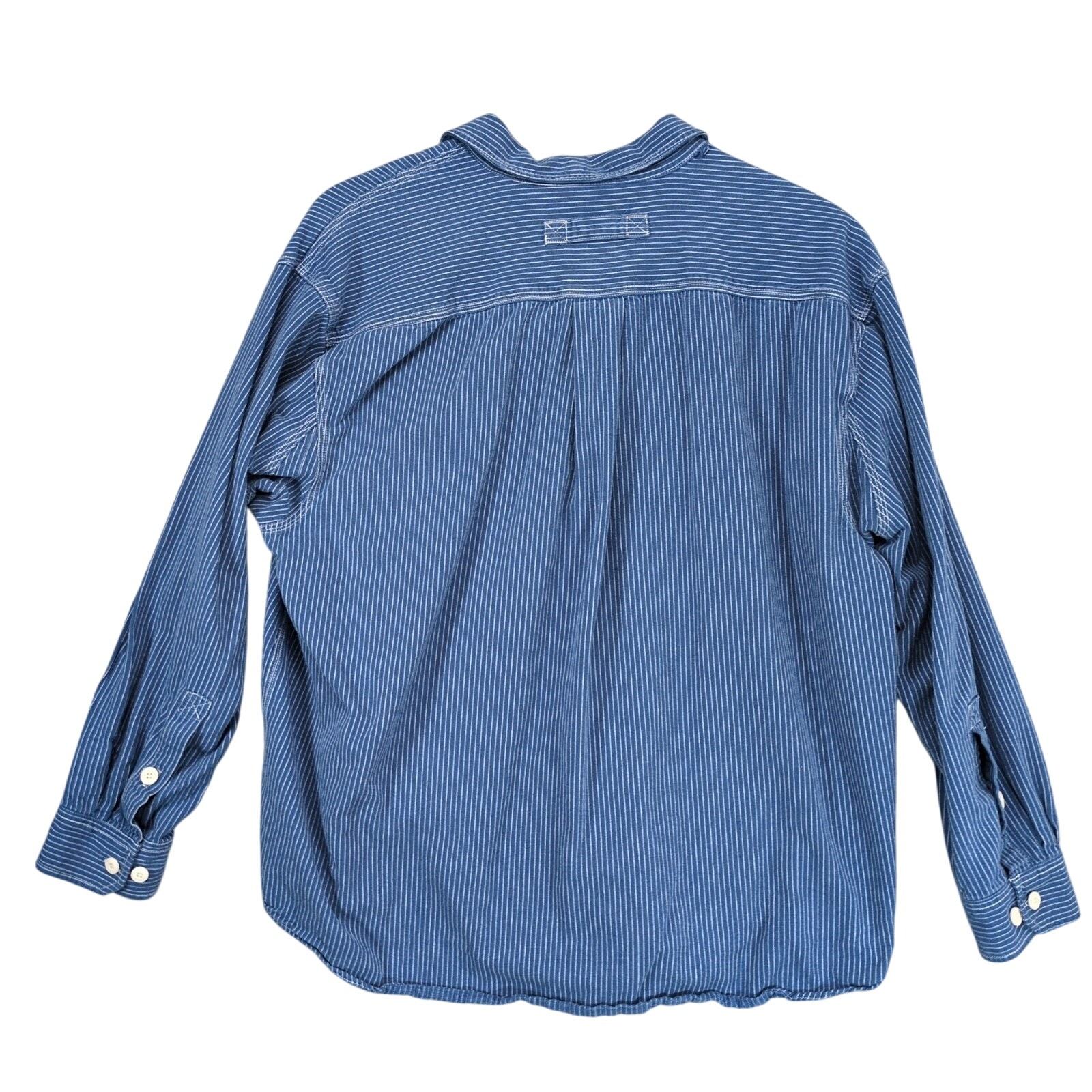 * Features: Heavyweight cotton in blue with white stripes stitching, button front, 2 button pockets, collared neckline, long sleeves with button cuffs