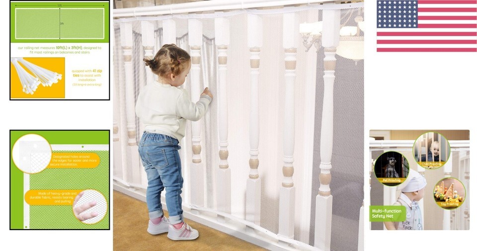 - Durable 10ft x 3ft Baby Banister Guard - Child Safety Net for Stairs and Pets