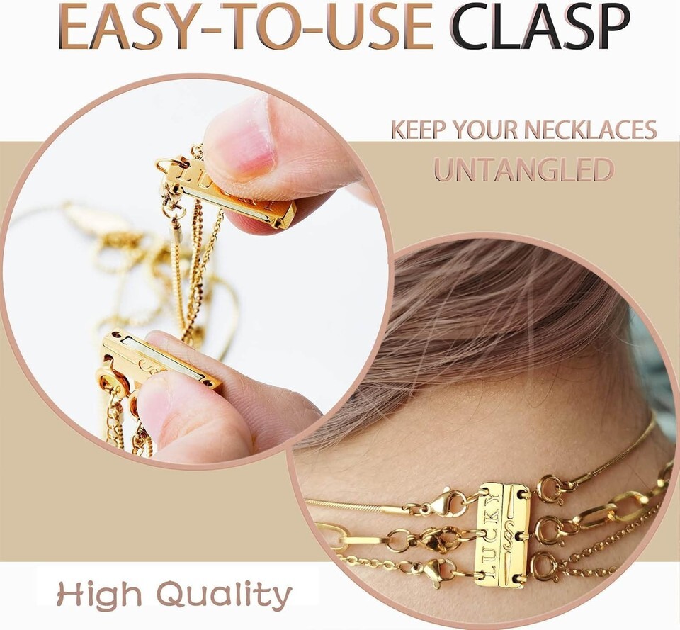 Layered jewelry shouldn?t be complicated! Our Durable 18K Gold and Silver Layering Clasp is the essential accessory every woman needs to elevate her style effortlessly. Crafted from surgical-grade stainless steel, this clasp is not only stunning but also remarkably durable. With its patented design, you can easily connect multiple necklaces, ensuring they remain beautifully layered without tangles.