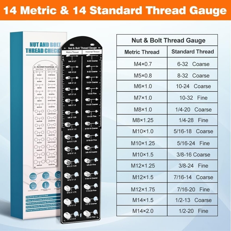 Extensive Thread Range: Covers 14 Metric thread sizes (from M4 x 0.7 to M14 x 2.0) and 14 Standard sizes (from 6-32 Coarse to 1/2-20 Fine).
