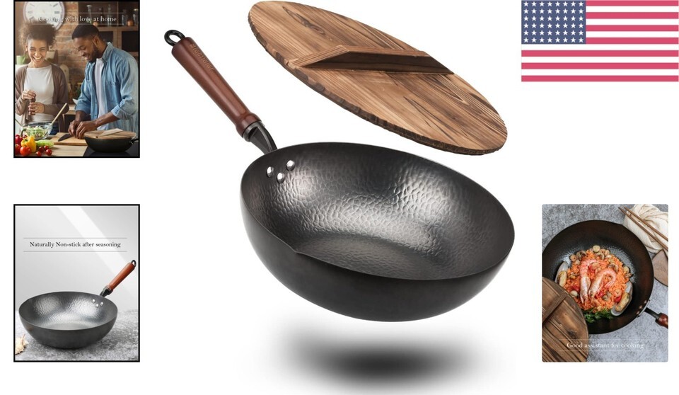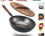- Durable Carbon Steel Wok – 12.5'' with Lid, Nitrided Surface for Healthy Cooking