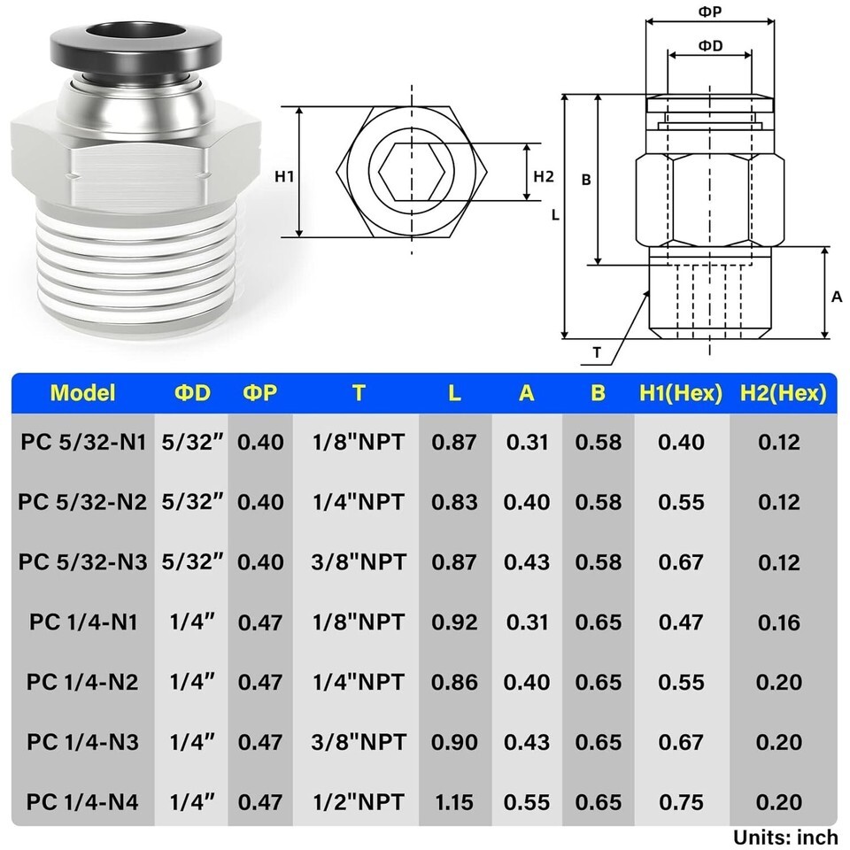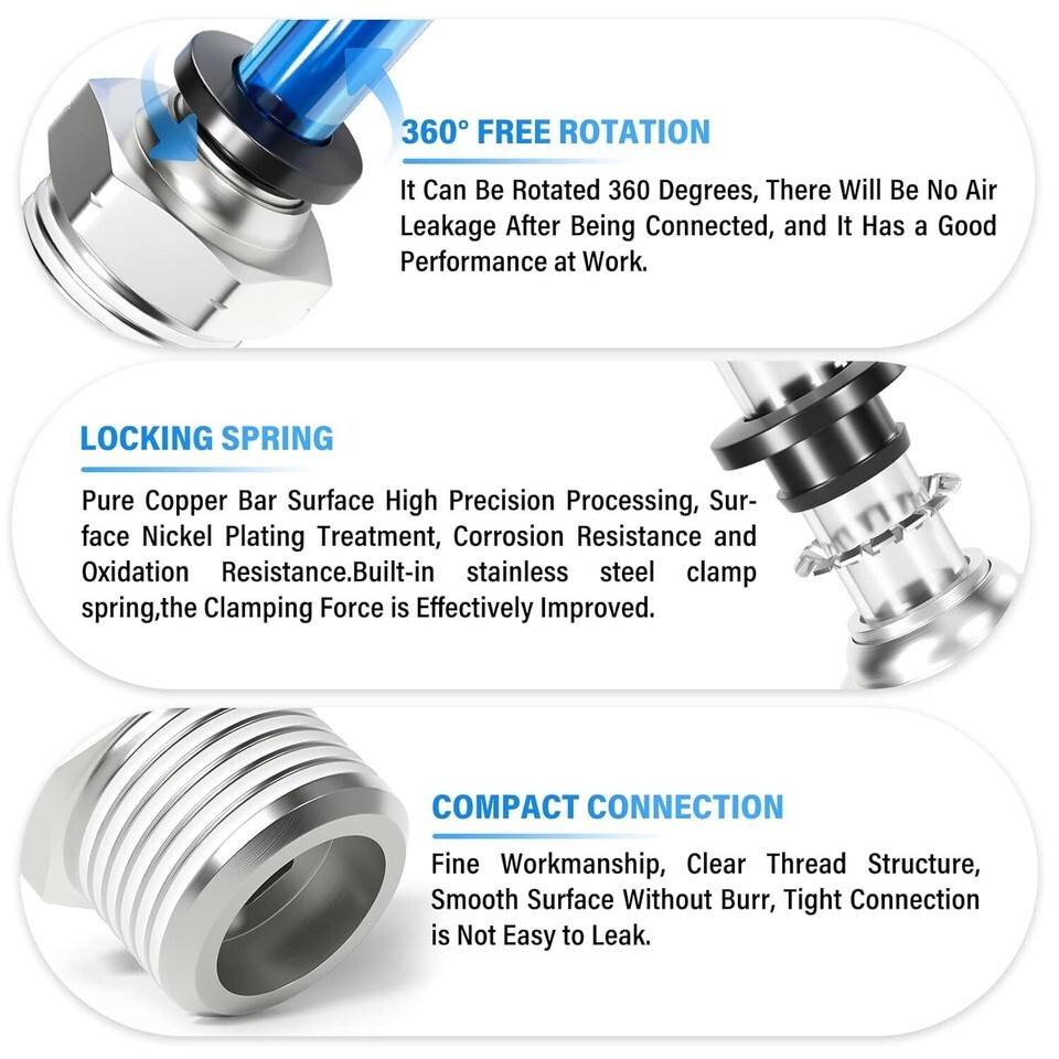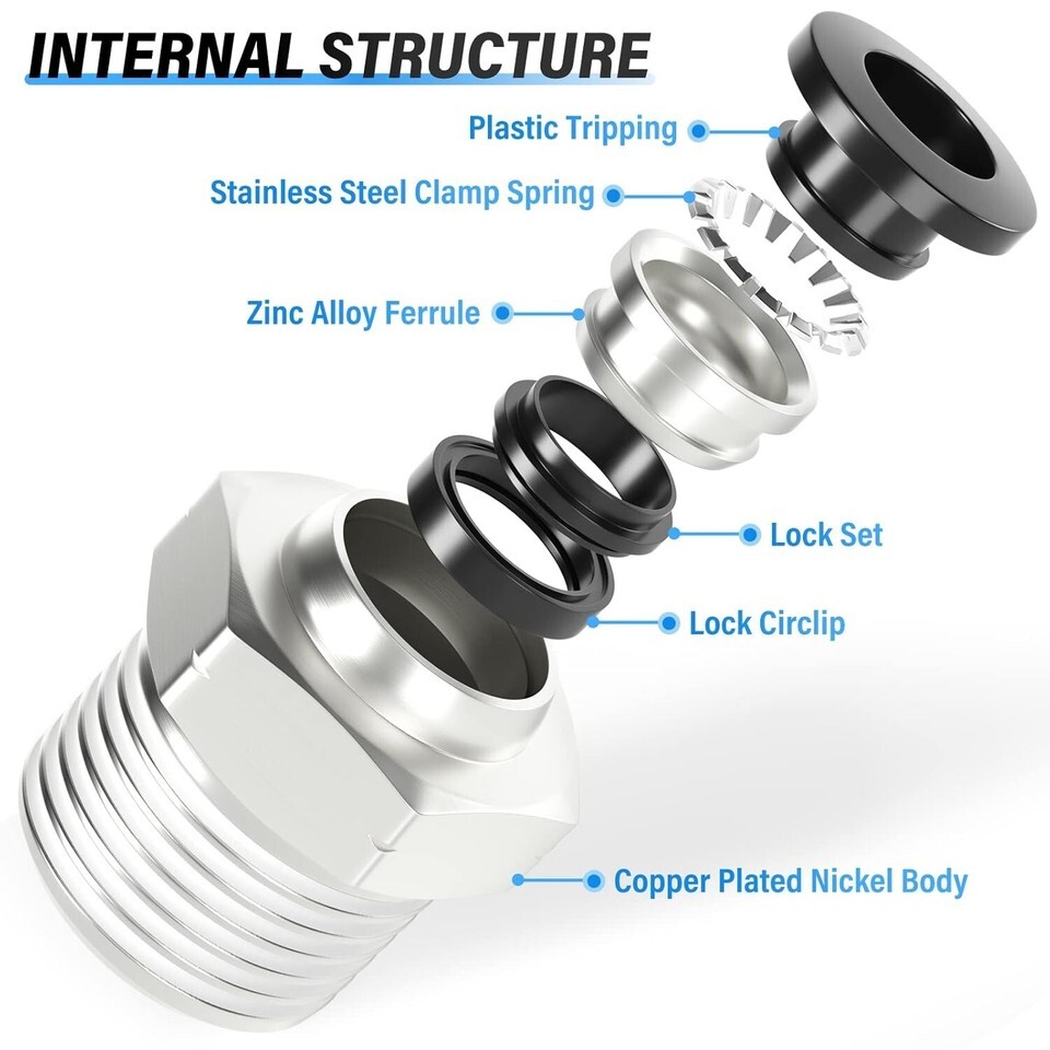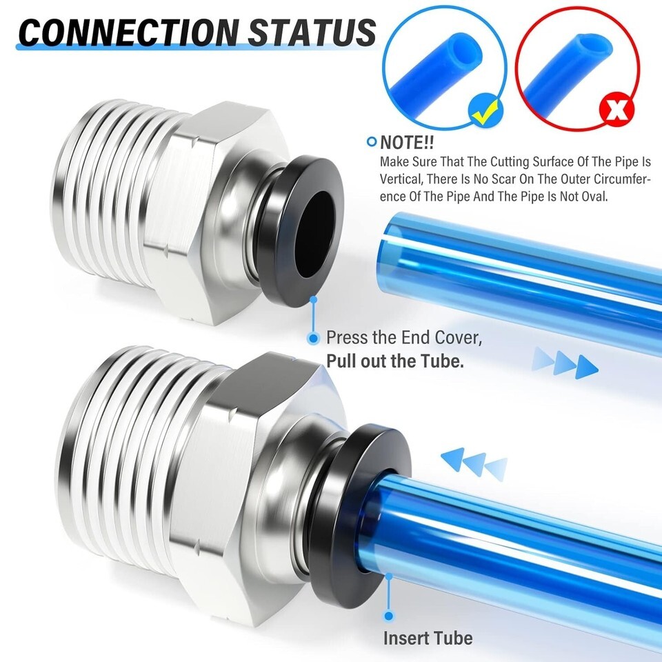 - Durable Male Push-In Connectors: 1/4" OD Tube & 1/2" NPT Threaded Fittings