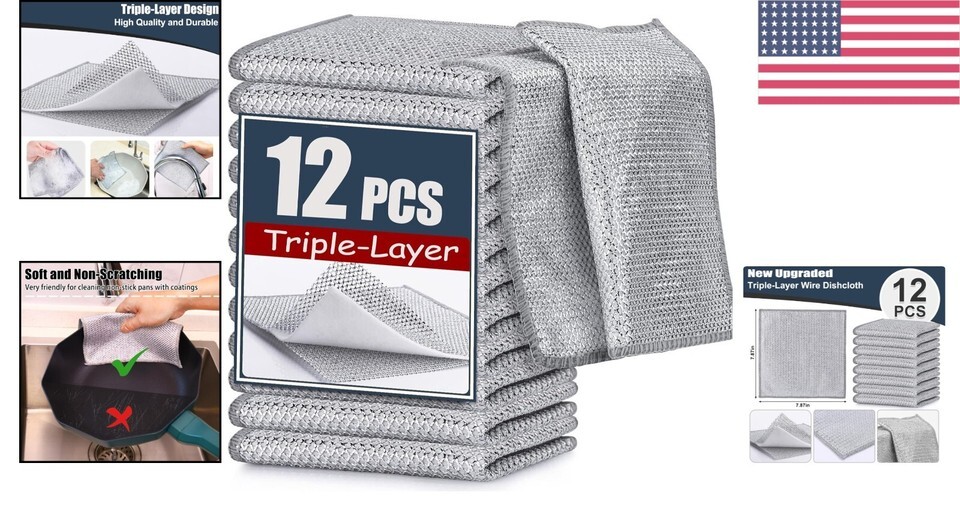 - Durable Triple-Layer Steel Wire Dishcloths – 12 Pack for Effortless Cleaning