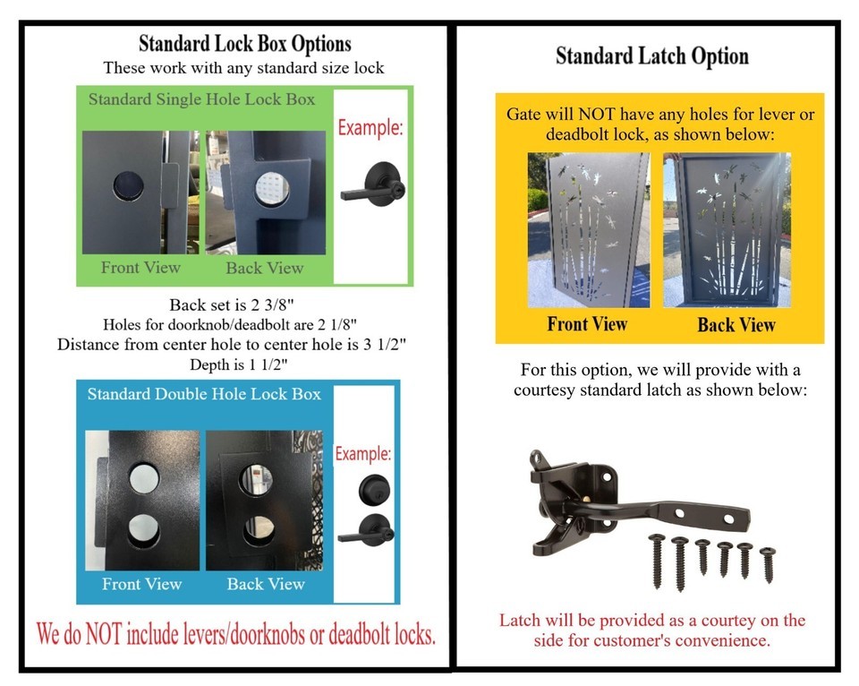 6. Fabricated with 1 or 2 standard 2 1/8" holes for standard lever and bolt lock. Customer supplies lever and bolt lock. Customer decides hinge side and gate swing.