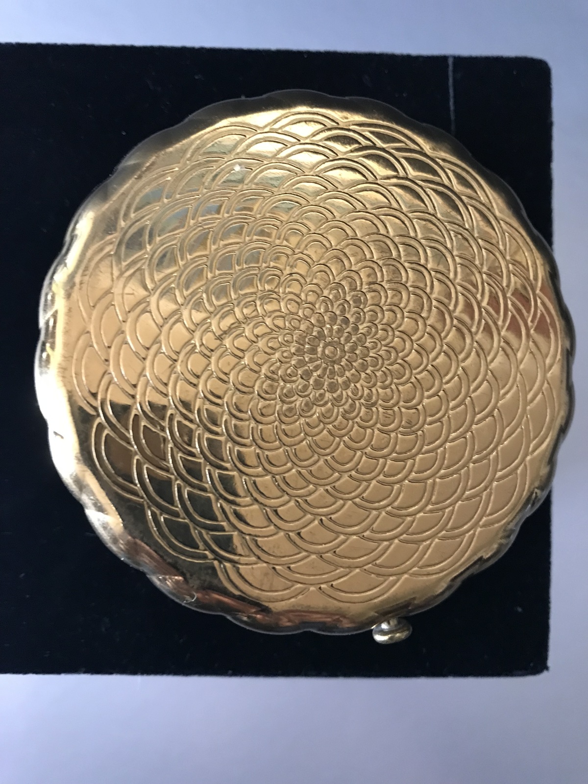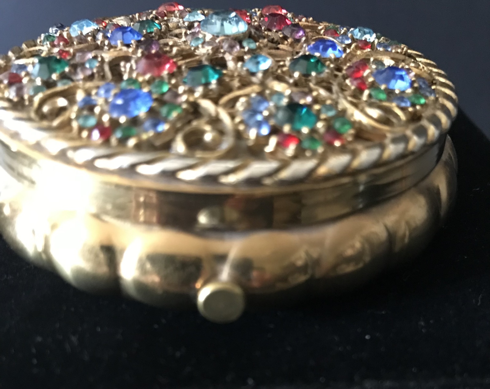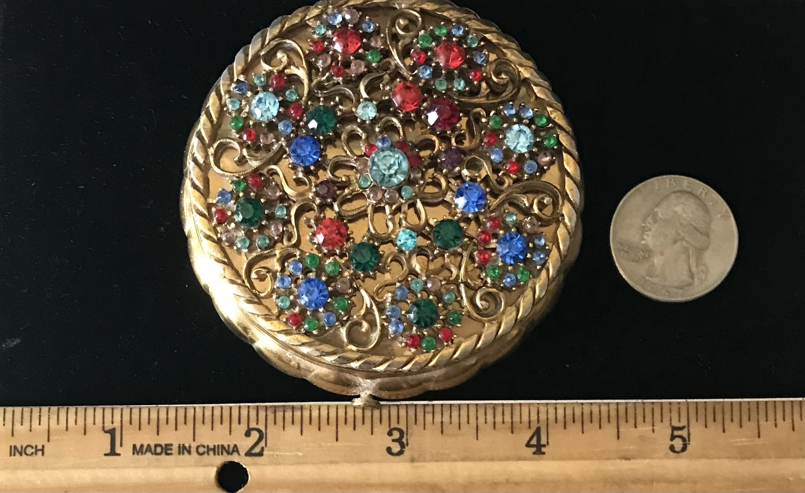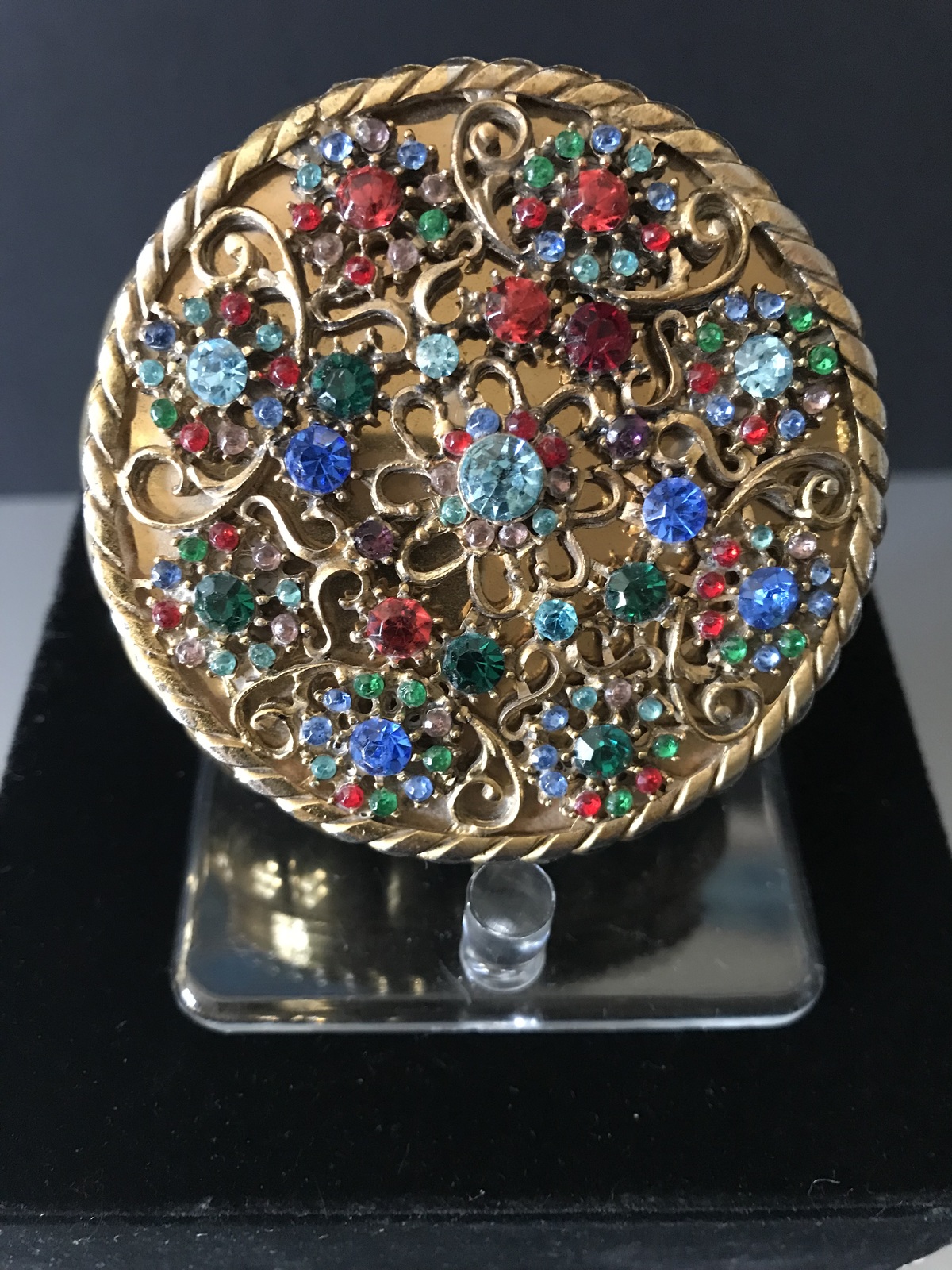 This beautiful 40's Durset compact is in remarkable condition. Honestly, we've looked around and most of these are scratched or the mirrors have issues but this one's about as perfect as it can be in all areas. Really makes us truly appreciate it's unique beauty. Another different aspect of this compact is that the outside rhinestone's and the center ones are in a flower pattern, really very pretty, at least to us anyway. What do you think?