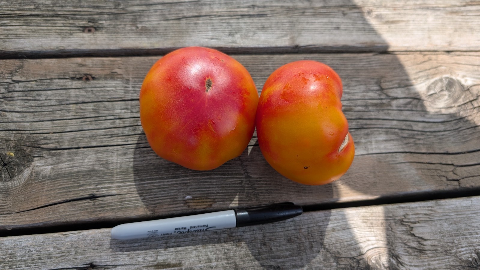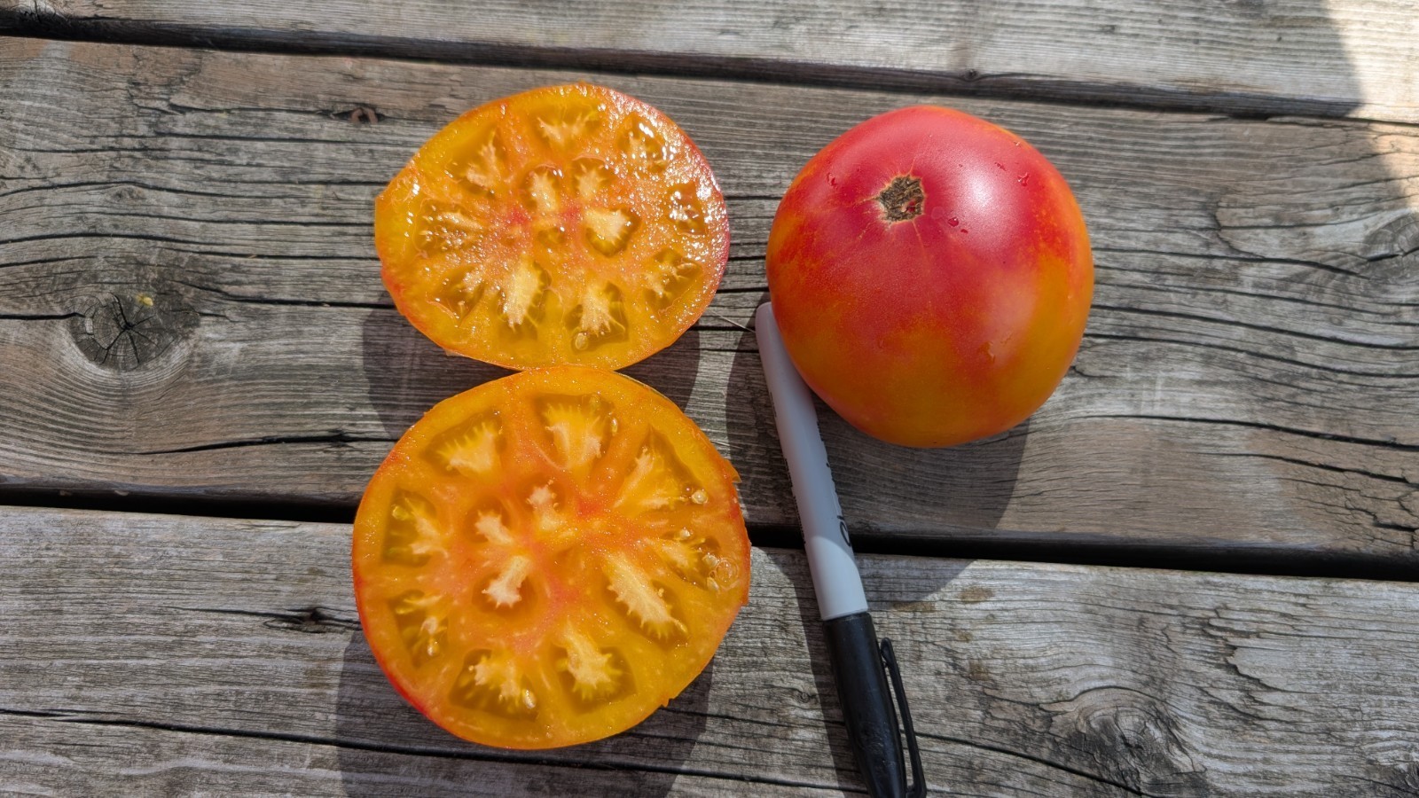 Fruit color is a vibrant blend of yellow, pink, and orange with red swirls and marbling. The tomatoes are oblate and slightly ribbed, measuring about 3 to 4 inches across. They are not considered cherry tomatoes. Fruit weight ranges from 6 to 8 ounces, with some reaching up to 9 ounces.