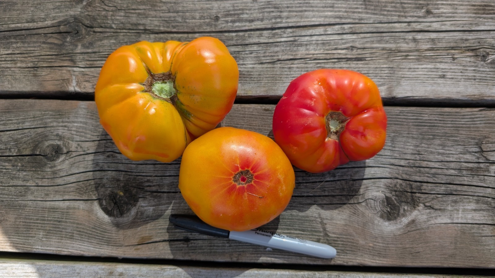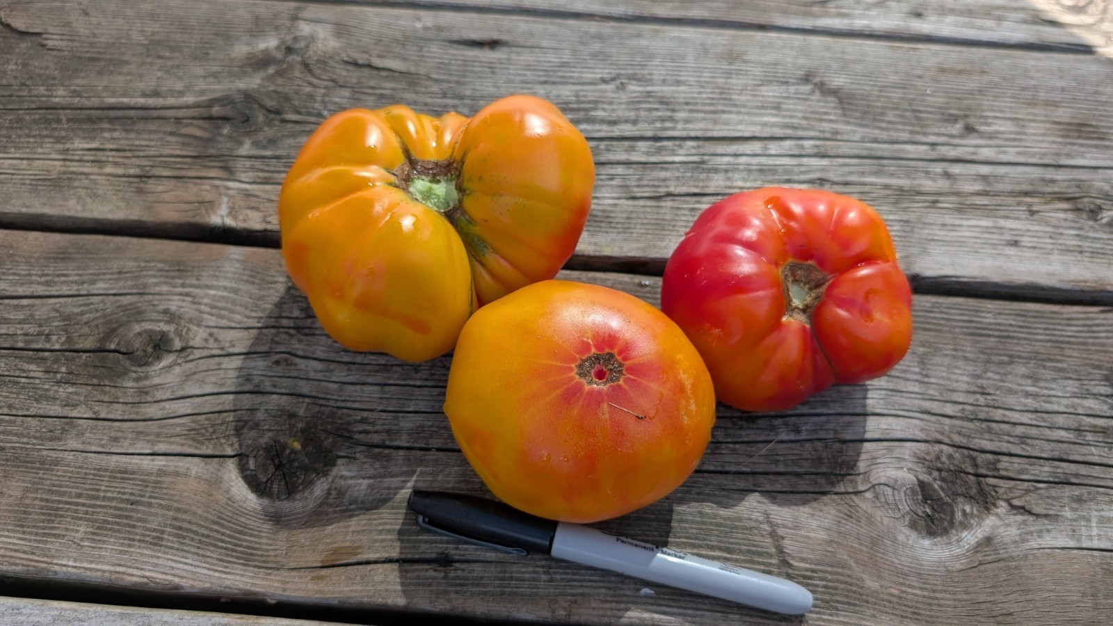 Fruit color is a striking yellow with red swirls, giving it a marbled, sunset-like appearance. The tomatoes are oblate (flattened) and smooth, measuring about 3 to 4 inches across. They are not cherry tomatoes. Fruit weight ranges from 5 to 20 ounces, with most averaging around 8 to 16 ounces.