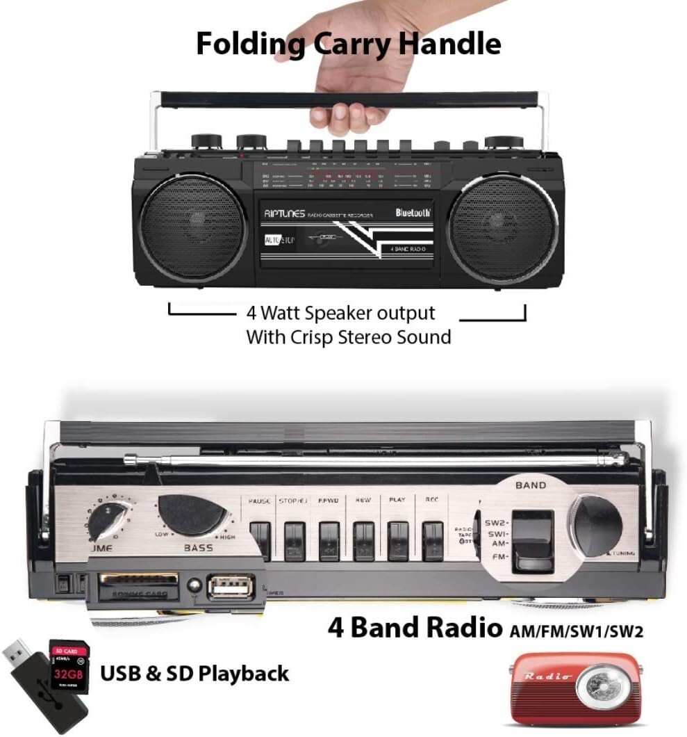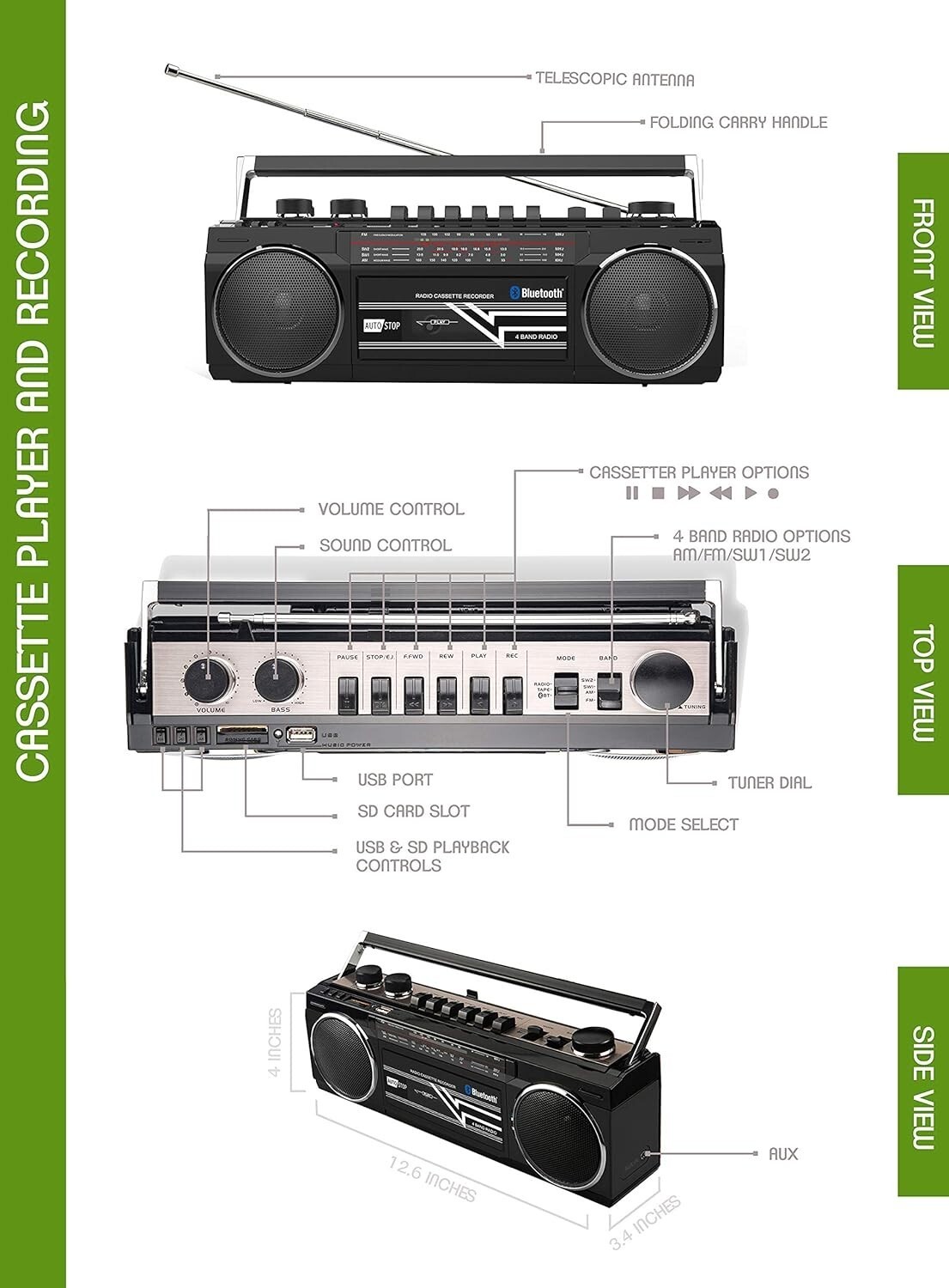Features: Bluetooth,Cassette Player,AM/FM Radio,Shortwave Radio,USB Playback,SD Playback,Volume Control,Bass Control,Portable Design,Telescopic Antenna,Folding Carry Handle