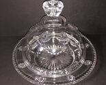 The EAPG Beady-Brady Works Beaded Festoon Covered Butter Dish is a vintage collectible piece made of glass with a Jewel Festoon pattern. This set includes a stand and lid, making it a practical and decorative addition to any kitchen or dining room. The clear glass and intricate design make it suitable for all occasions, adding a touch of elegance to your table setting. Measuring 7.25 inches in diameter and 5.5 inches in height, this original butter bell from Beady Brady is a unique and charming piece for any collector or enthusiast of vintage dinnerware.