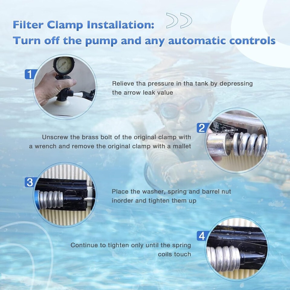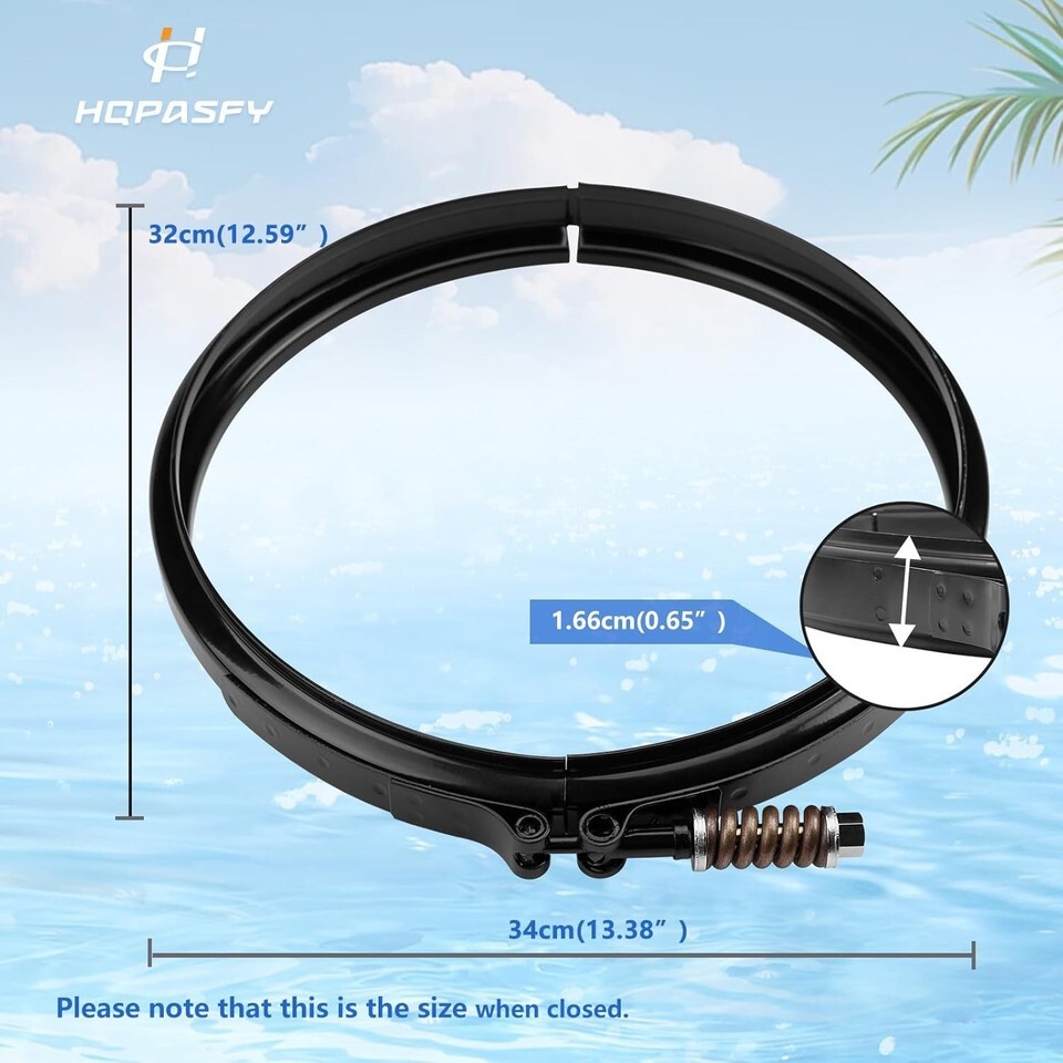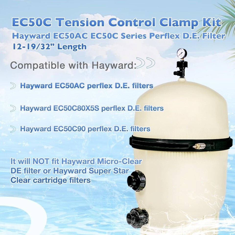 HQPASFY EC50C 12-19/32" Length Tension Control Clamp Assembly Compatible with Hayward EC50AC EC50C Series Perflex D.E. Filter ?APPLICATION?The pool filter clamp with spring compatible with Hayward EC50AC, EC50C80X5S and EC50C90 series perflex D.E. filters. NOT fit Hayward Micro-Clear DE filter or Hayward Super Star Clear cartridge filters ?HIGH QUALITY?Long life-span matters, that is why our tension clamp is made of high-quality material which prevent leak and premature failure to ensure it can work for a long time ?FEATURE?As time goes on, the filter clamp starts to get old and the threads will begin to strip, if the clamp breaks the filter tank top will explode off. Replace the filter clamp, you can protect your filter, will not cause you too much loss ?DIMENSION?This filter clamp assembly, with a closed - size of 32cm (12.59 inches) in height and 34cm (13.38 inches) in width, and a specific dimension of 1.66cm (0.65 inches) as shown in the detail, keeps a tight seal between the two filter halves. Replacing the clamp is a simple and convenient process