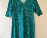 EDDIE BAUER Sz L Midi Stretch Green Dress Shift Printed Shirred V Neck