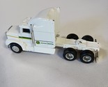The ERTL White John Deere Tractor Semi Truck is approximately 5" long diecast and plastic model featuring the John Deere brand. This truck is designed with 10 wheels and is not autographed or customized. The color of the truck is white, and it showcases advertising for John Deere. It is a toy vehicle in contemporary manufacture, suitable for collectors or enthusiasts of John Deere products. Normal wear.