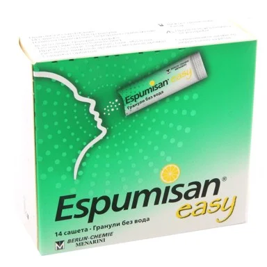 Espumisan easy of the pharmaceutical company Berlin-Chemie is a medical device that is used to effectively relieve flatulence (accumulation of gases in the gastrointestinal tract) and to reduce the feeling of abdominal discomfort, swelling, heaviness in the upper abdomen and gurgling in the gastrointestinal tract. It quickly dissolves in the mouth, thus the active substance quickly reaches the gastrointestinal tract, where it acts. The sachets have a pleasant lemon flavor and contain simethicone. Available in a pack of 14 sachets.