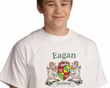 Product description: Eagan Irish Coat of Arms Tee Shirt in White. Every Irish family has a story to tell, probably hundreds of stories. Your Irish coat of arms is a visual record of your family's oldest, most significant stories. Here, they're told in bright, permanent artwork on these fine-quality, 100% cotton Gildan tee shirts. Over 25 years of heraldry research and over 1000 available Irish family coat of arms.