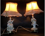 She's playing a fiddle and he's dancing to her tune! This great set of figural lamps are quite a metaphor for life and they also work very well. There's not a break or crack anywhere on either of these lamps, Their body's are in truly fine condition. However, their lampshades are a bit disfigured. We can't exactly say what the mauve material is made from. They are a combination of some type of celluloid material that makes up their bodies and they are trimmed with a material lacing and satin ribbon with all of those materials being stretched around wire frames that then comprise the lampshades. The shades have a wire clip that clip's directly onto the bulbs. The bottom's are a heavily patina'd solid brass.