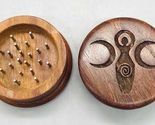 A simple tool for all your loose grinding needs. Simply add herbs to the base, replace the top and twist until the herb is as ground as you require. About 3 inches in diameter and about 1.25 inch deep (interior grinding space). Made of Sheesham Wood with a carved Triple Earth Goddess on top.