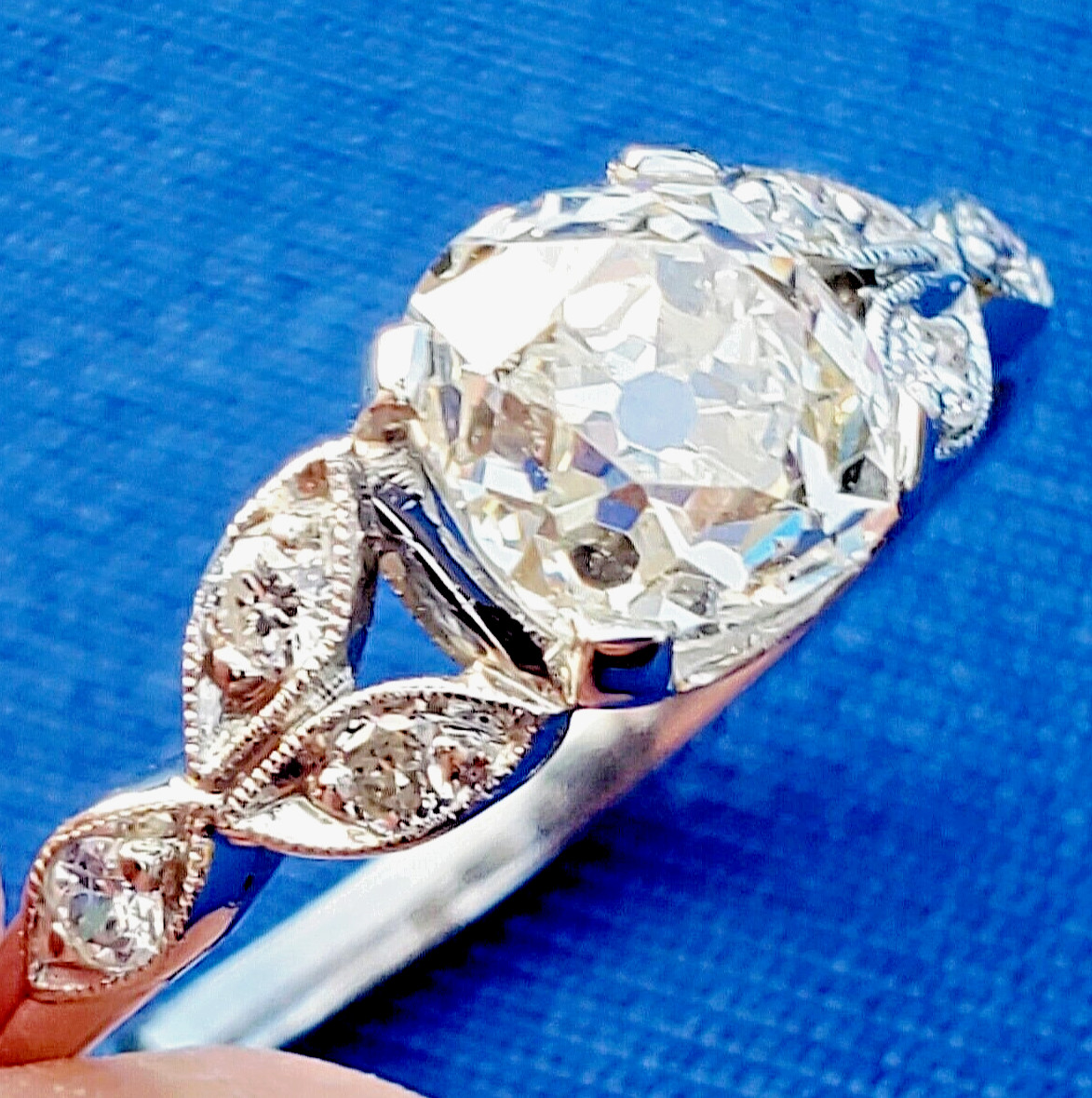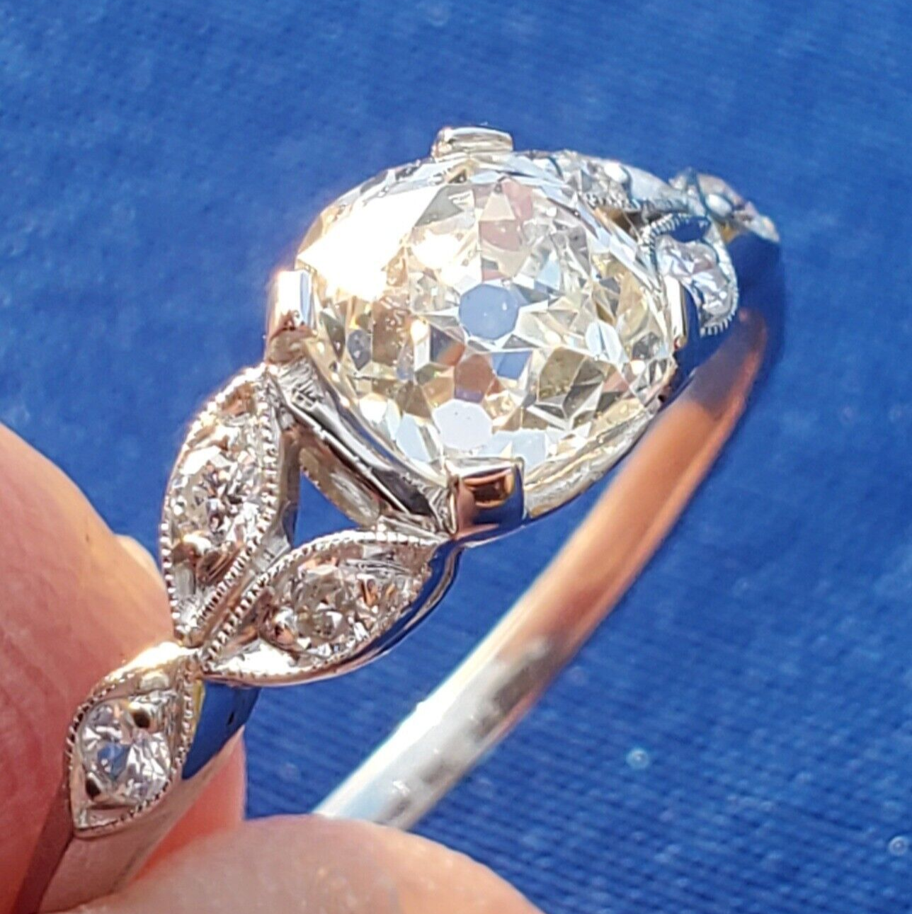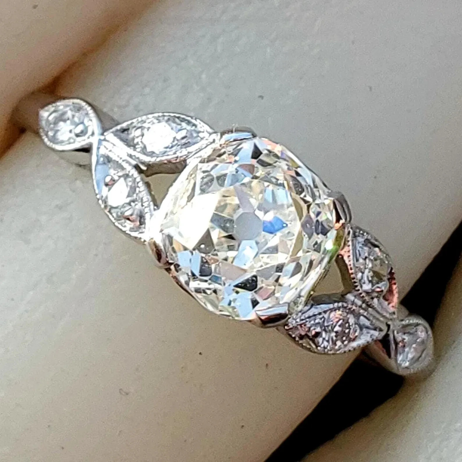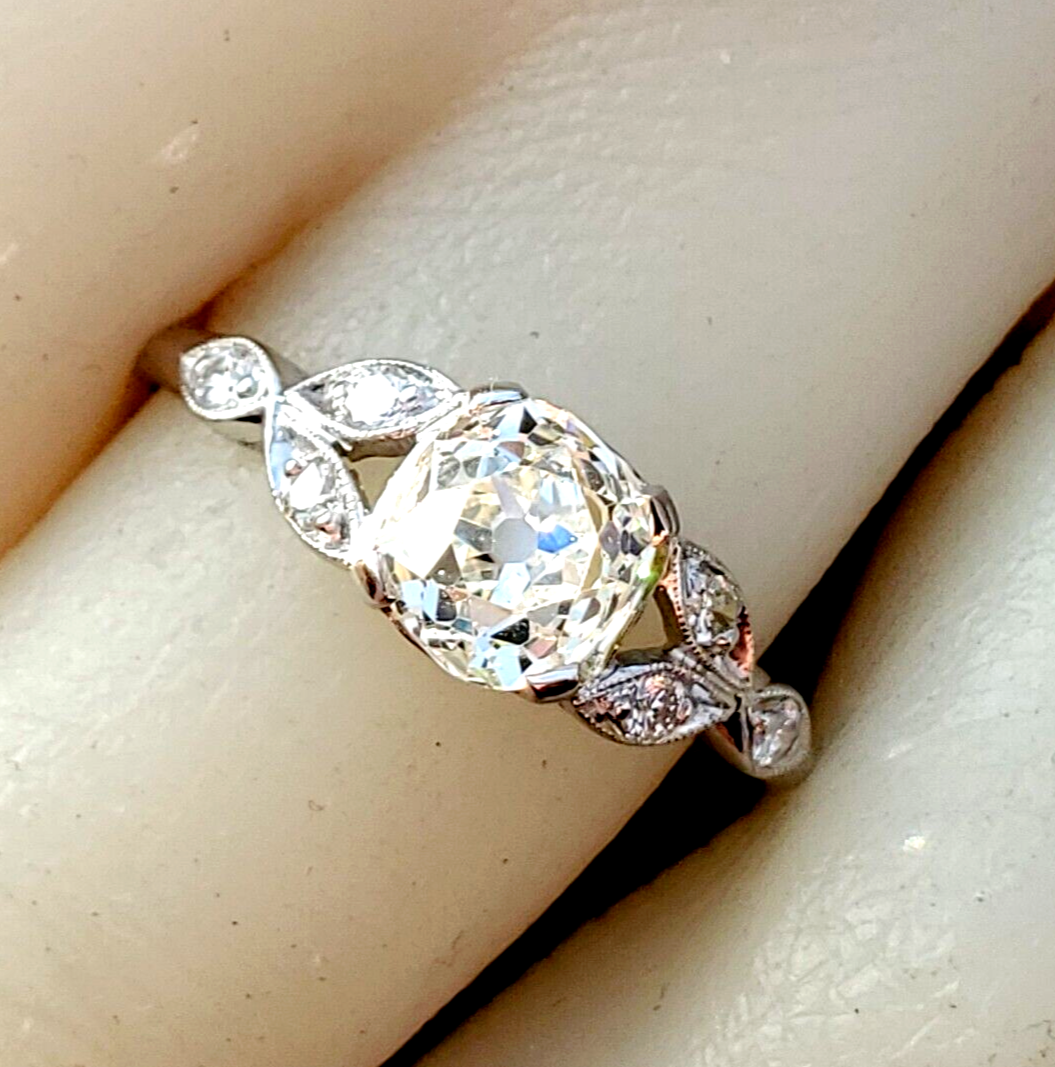 Earth Mined Diamond Deco Engagement ring Cushion cut Vintage Platinum Solitaire
