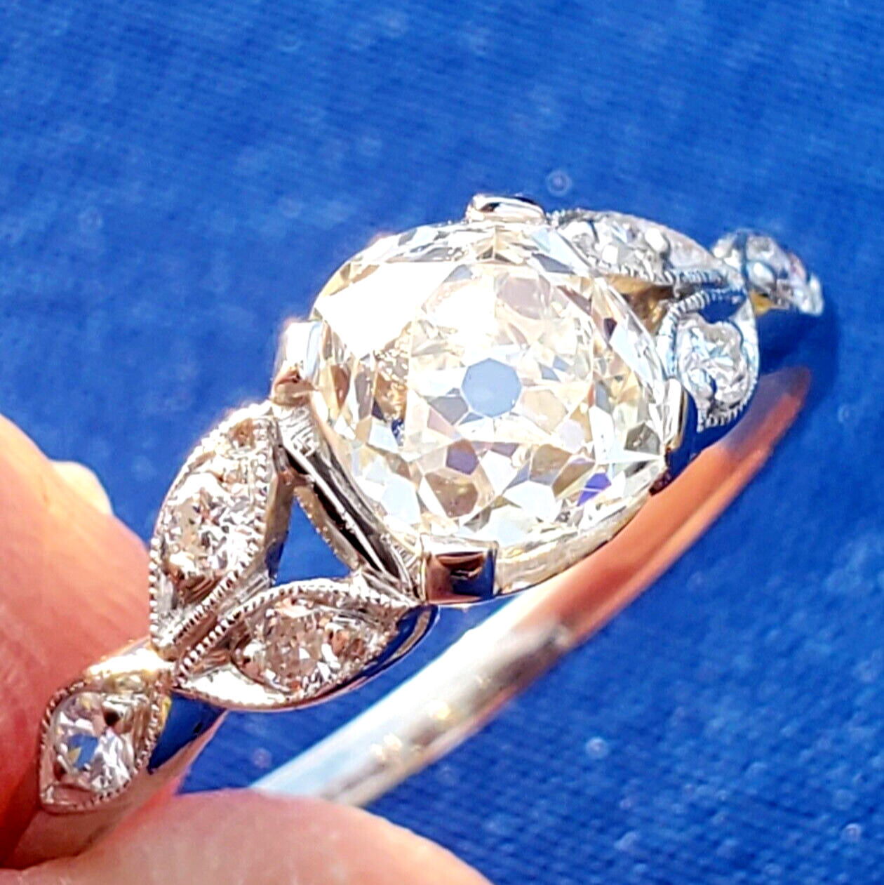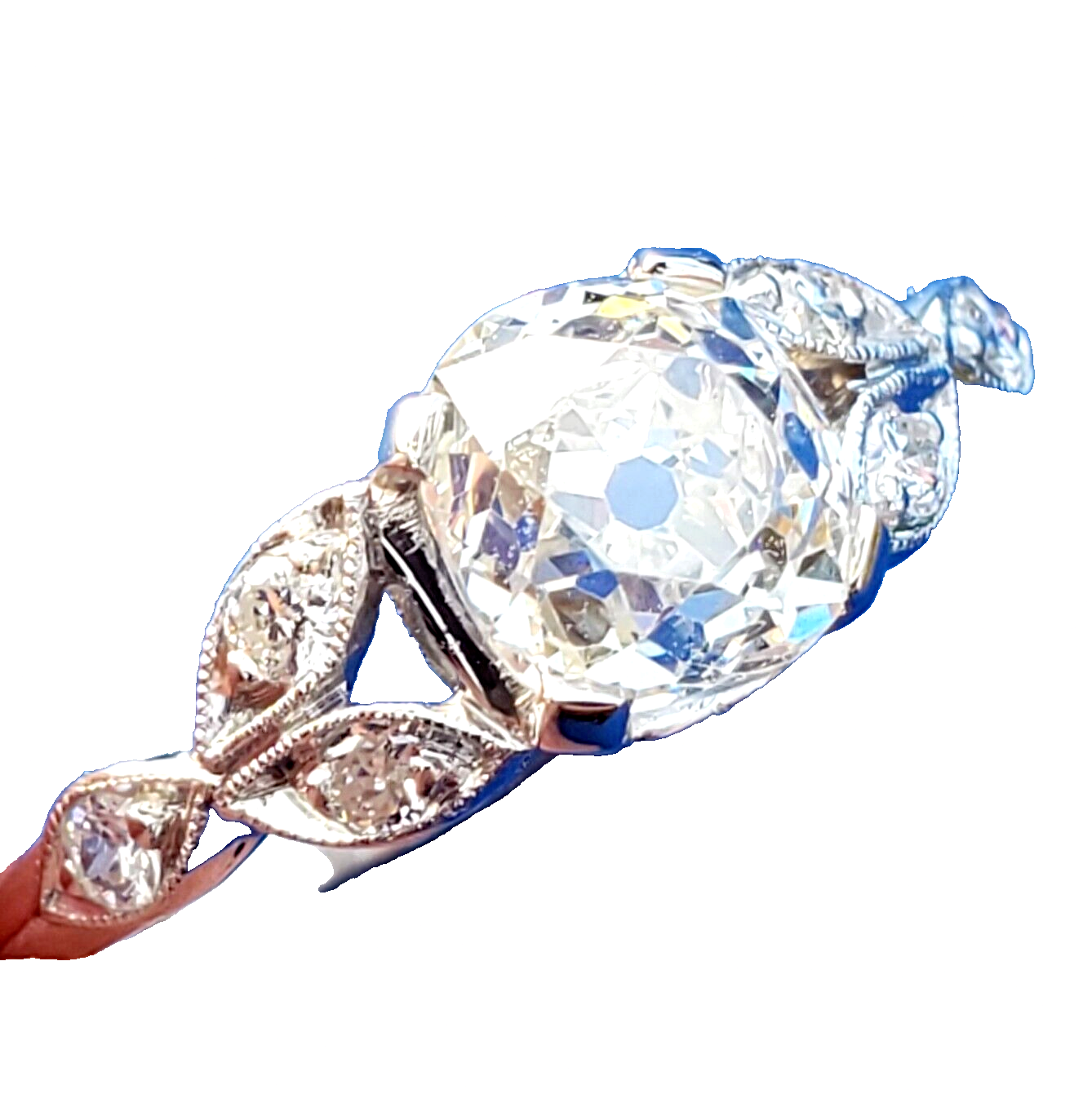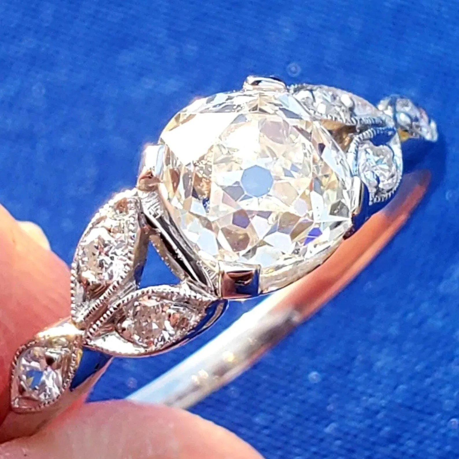 Earth Mined Diamond Deco Engagement ring Cushion cut Vintage Platinum Solitaire