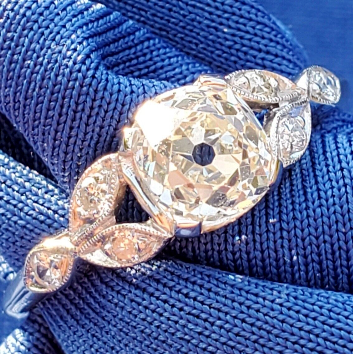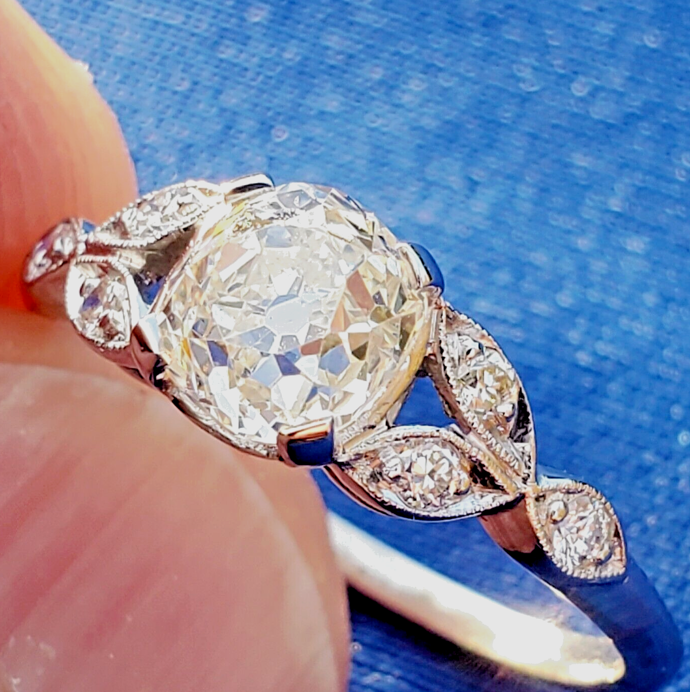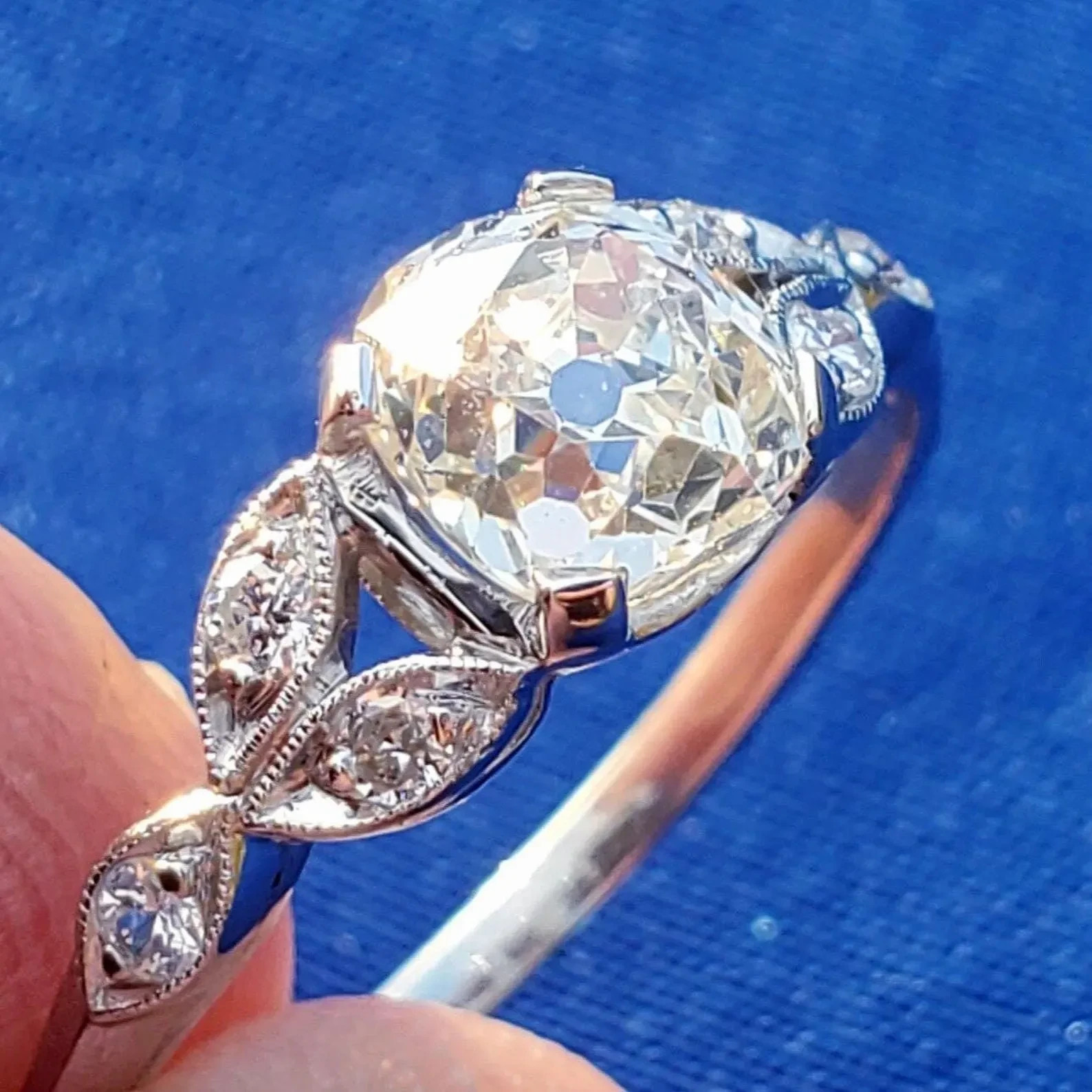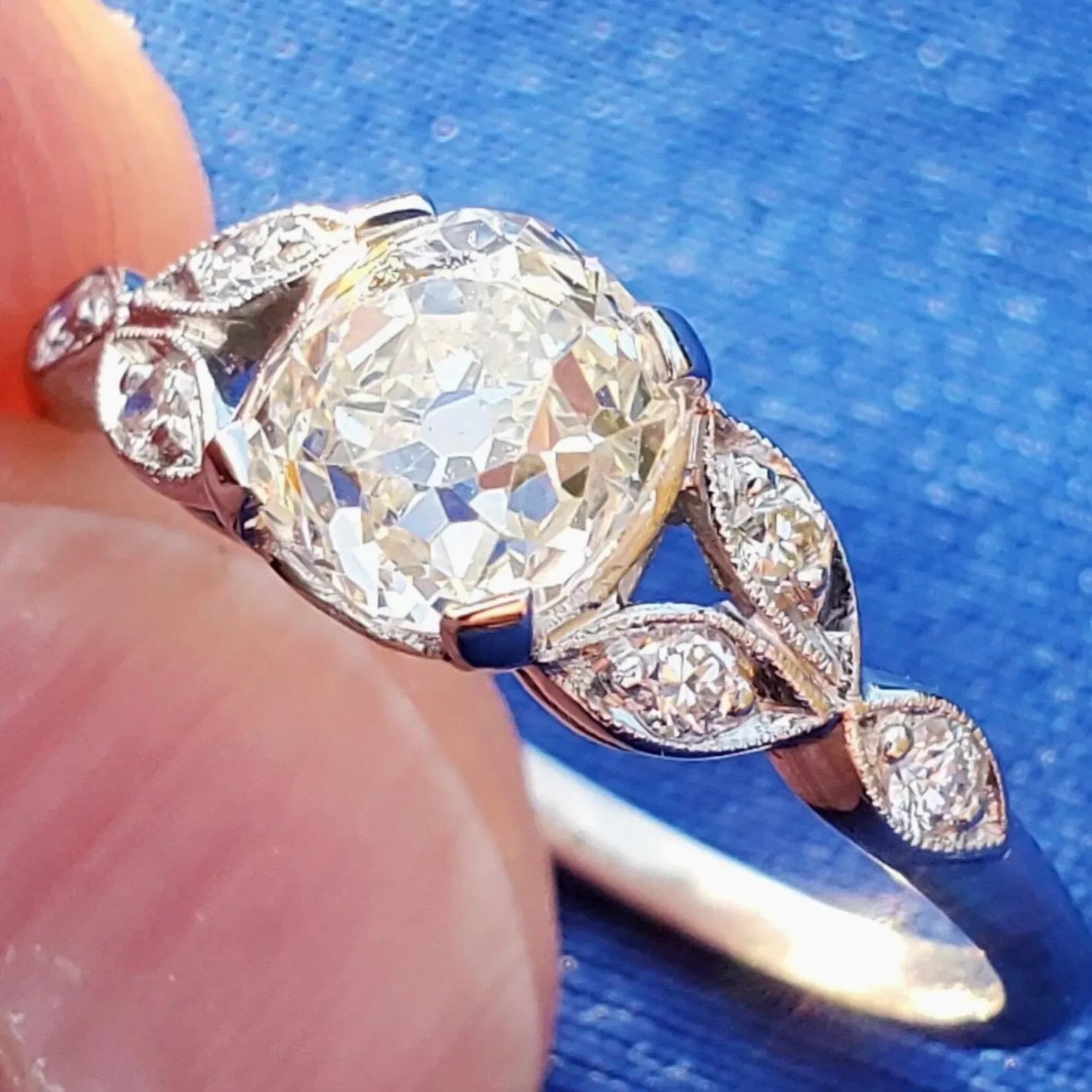 Earth Mined Diamond Deco Engagement ring Cushion cut Vintage Platinum Solitaire