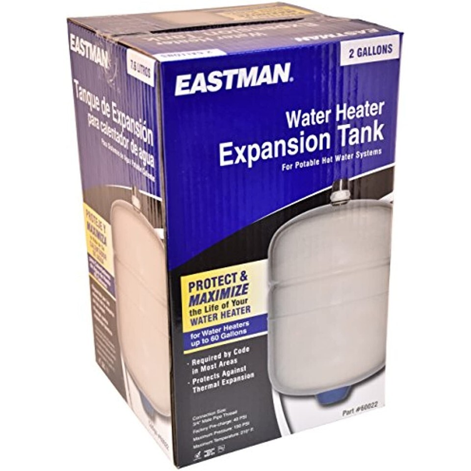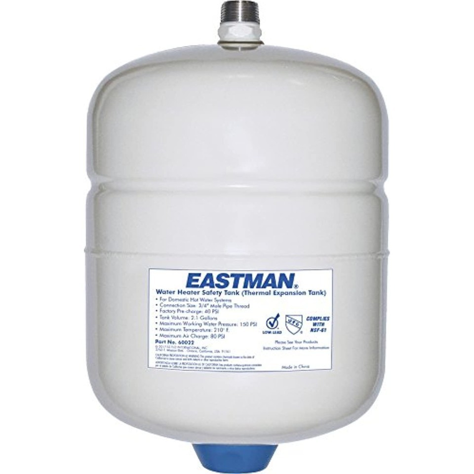 The Eastman 60022 2-Gallon Thermal Expansion Tank provides a secure connection to water heaters that prevents dangerous build-ups of pressure. This water heater expansion tank stops hot water from backflowing into the cold water line and it also prevents hot water from escaping through the pressure relief valve and onto the floor. Constant fluctuations in water pressure can be dangerous and they can damage the water heater, properly installing a thermal expansion tank can solve all these issues. The thermal expansion tank has a high-quality butyl rubber diaphragm and 304 stainless steel fittings for long-lasting performance. This product comes factory pre-charged at 40 psi. It complies with Lead-Free Law.